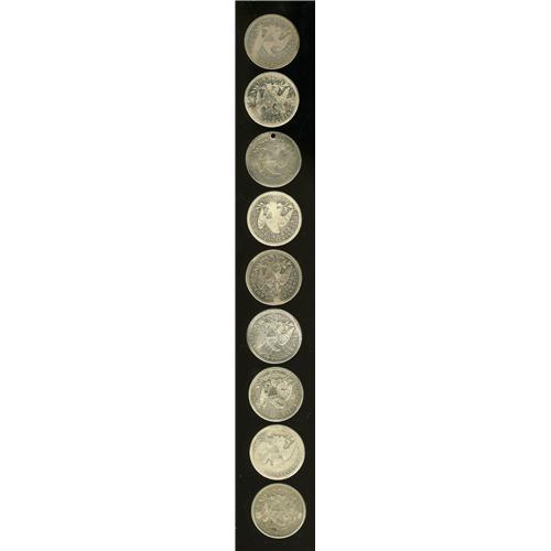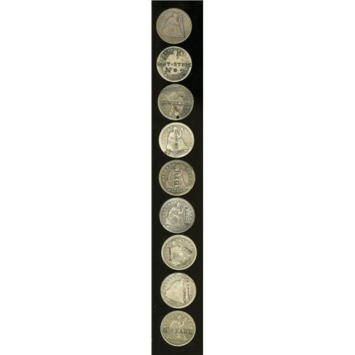 <B>U.S. Seated Liberty Quarter Counterstamped Group Lot.</B></I> Nine different quarters, listed by name (with or without location), and Brunk/Rulau catalog number, if listed: 1853 Arrows and Rays, Chas. Wendell, Brunk-42630; 1853 Arrows and Rays, G. A. Munn; 1853 Arrows and Rays, E. Weller, holed; 1853 Arrows and Rays, Cast-Steel No 2; 1853 Arrows and Rays, J.W. Brown; 1853 Arrows and Rays, L. Rice; 1854 Arrows, B.C. Hoff, Rulau NY-Sy 11E, Brunk-19830; 1862, W. Millar, Toronto; and 1876, G.H. Paul. The current market value is about $150-$250.<BR><BR><b>Shipping:</b> Coins & Currency (<a target="_blank" href="http://www.heritageauctions.com/common/shipping.php">view shipping information</a>)