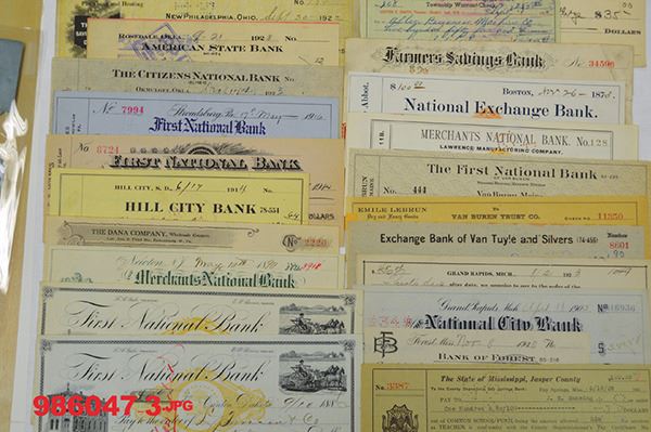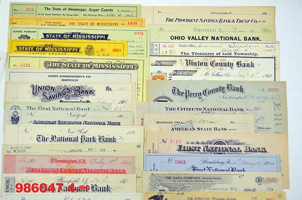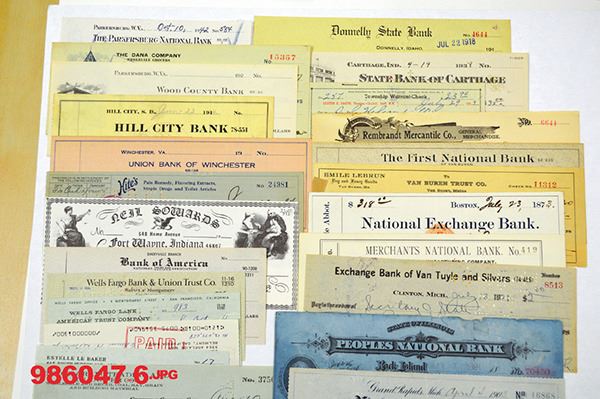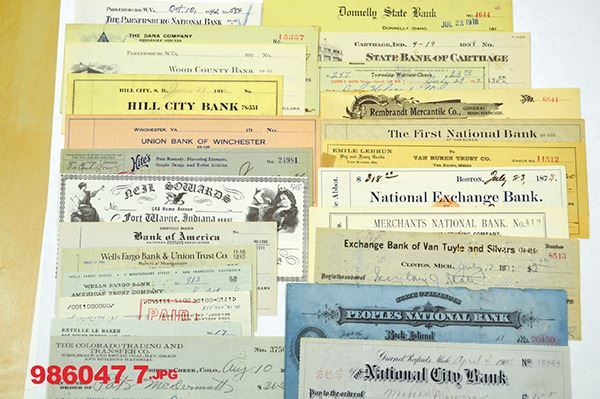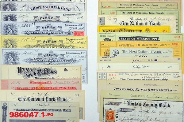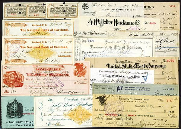 U.S. Bank Checks. Selection which include some with printed revenue stamps. 1870s-1960s. Some unused, most issued and cancelled. Some bank duplication. Very Fine or better. Over 110 pieces.