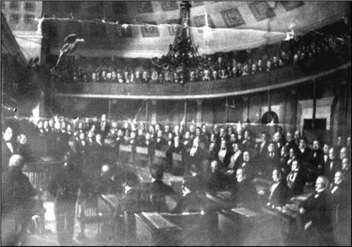 U.S. Senate Chambers. Large, unusual print, 33 x 41, of about 71 Senatorial portraits (plus several with their backs to camera). C. 1846. Balcony filled with visitors and ladies. Printed at bottom, "Engraved from daguerreotype likenesses in the National Miniature Gallery of Anthony Clark... published 247 Broadway, New York City." Waterstaining at margin, cracked at original fold, else fascinating!