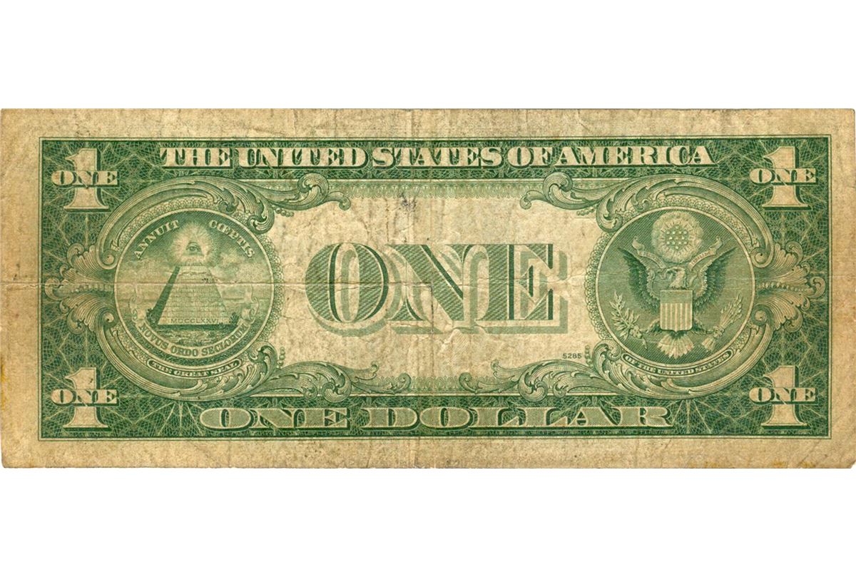 U.S. Series 1935 Inverted Overprint $1 Silver Certificate Bank Note. The overprint includes both serial numbers, Treasury Seal, both signatures, and the serial date.