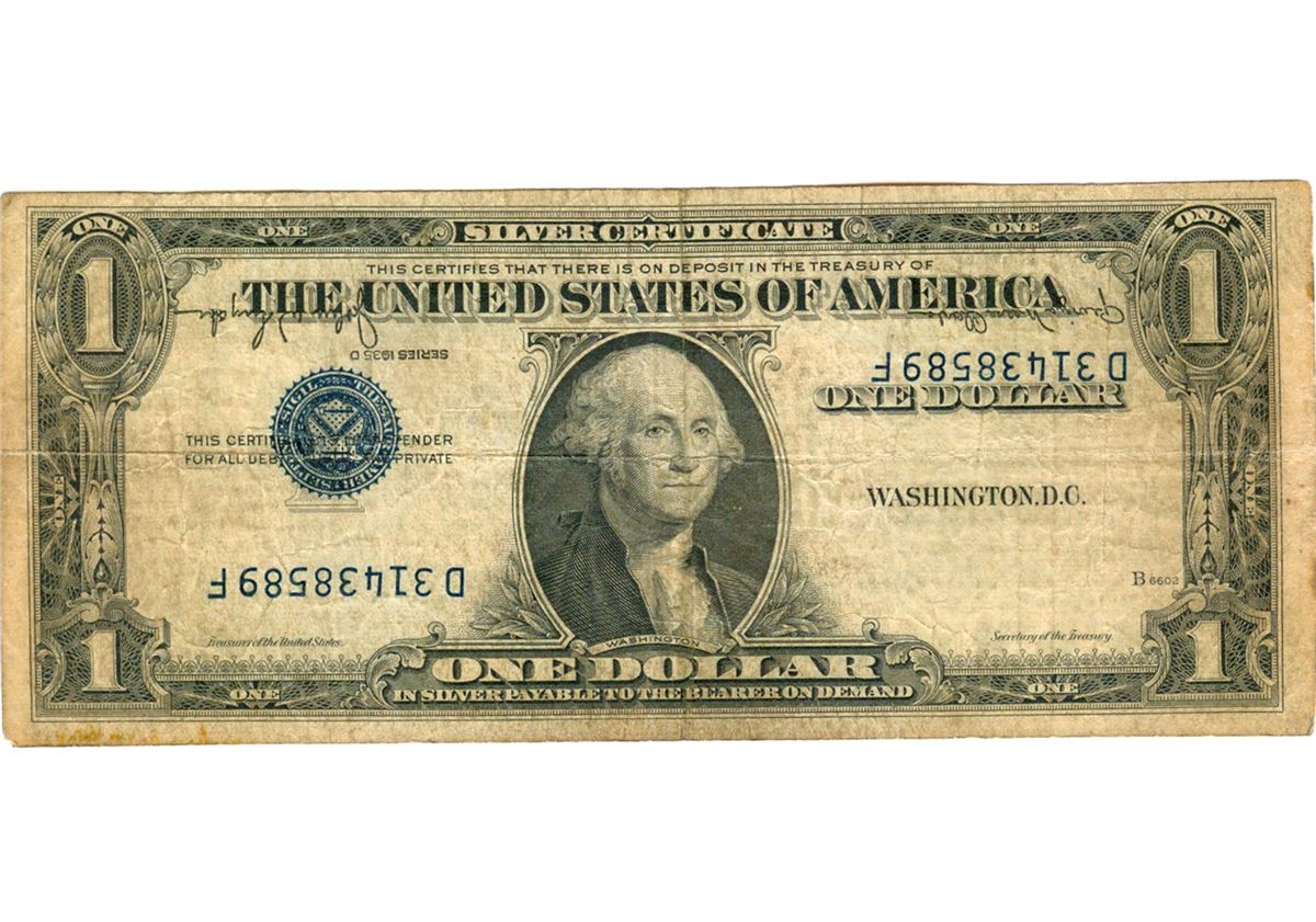 U.S. Series 1935 Inverted Overprint $1 Silver Certificate Bank Note. The overprint includes both serial numbers, Treasury Seal, both signatures, and the serial date.