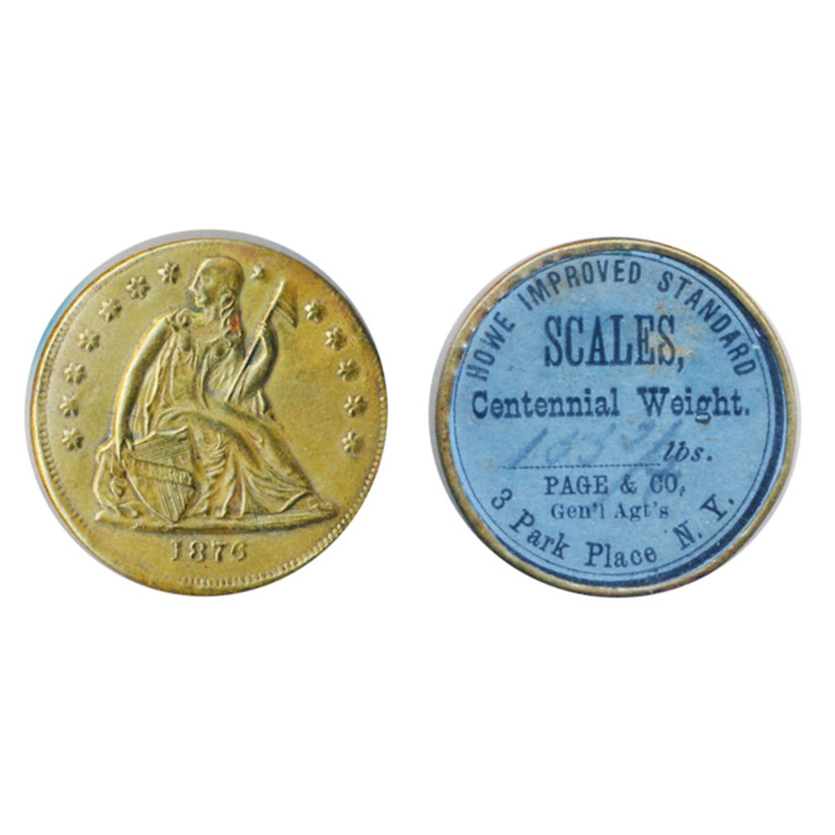 U.S. Shell Card. The obverse is a copper shell. 1876 Liberty Seated dollar. The reverse ‘HOWE IMPROVED STANDARD SCALES, 3 PARK PLACE, N.Y. Very Fine.