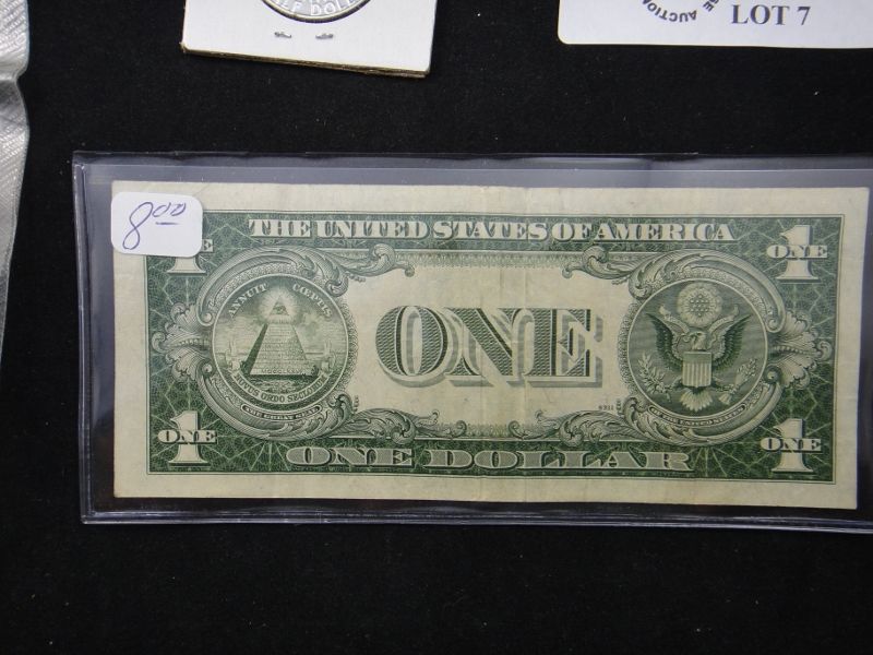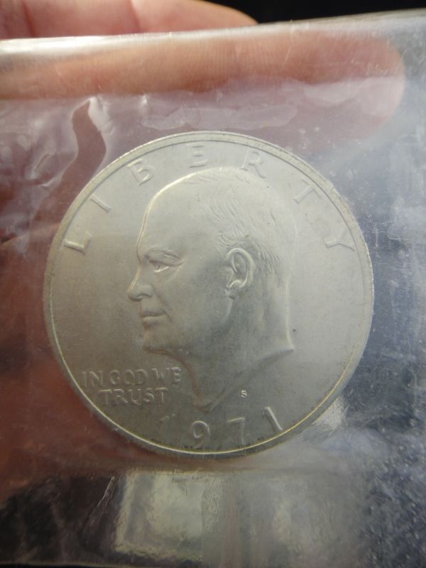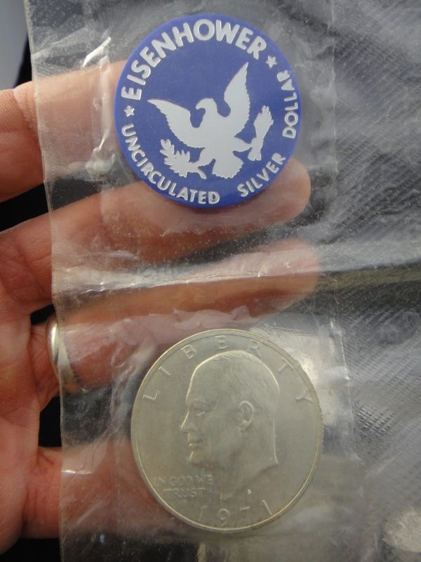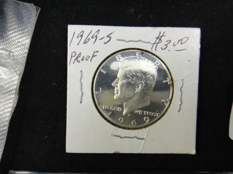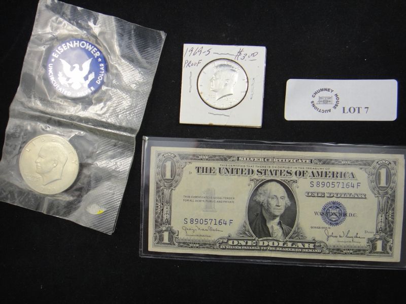 1971-S Ike Silver Dollar, 1969-S JFK Silver Half Proof and Silver Certificate One Dollar Bill.