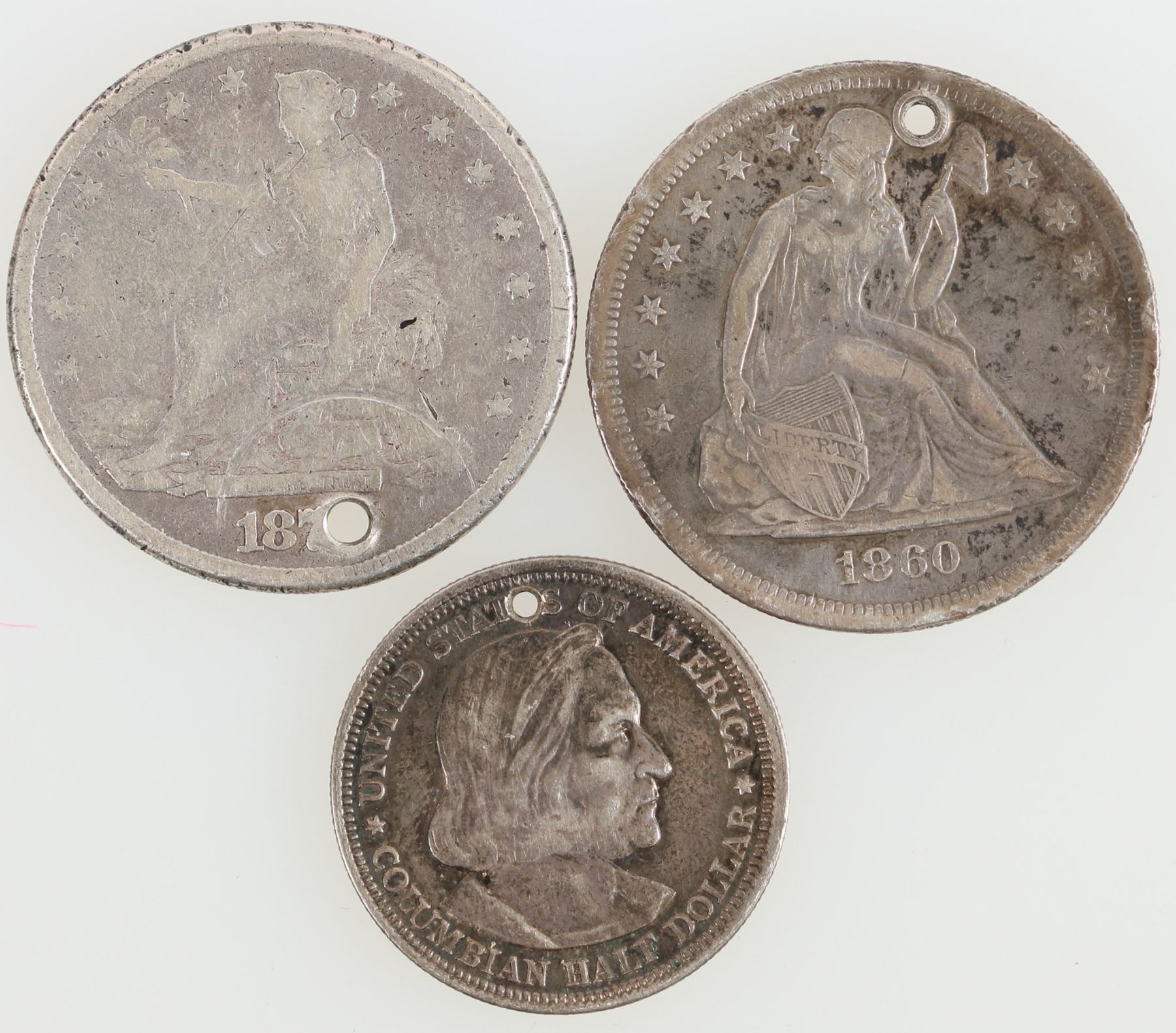 Three silver U. S. coins with holes: 1860-O Seated Liberty dollar; 187?-S Trade dollar; 1893 Columbian Exposition half dollar. Total weight 2.08 troy ounces silver. They're very small holes.