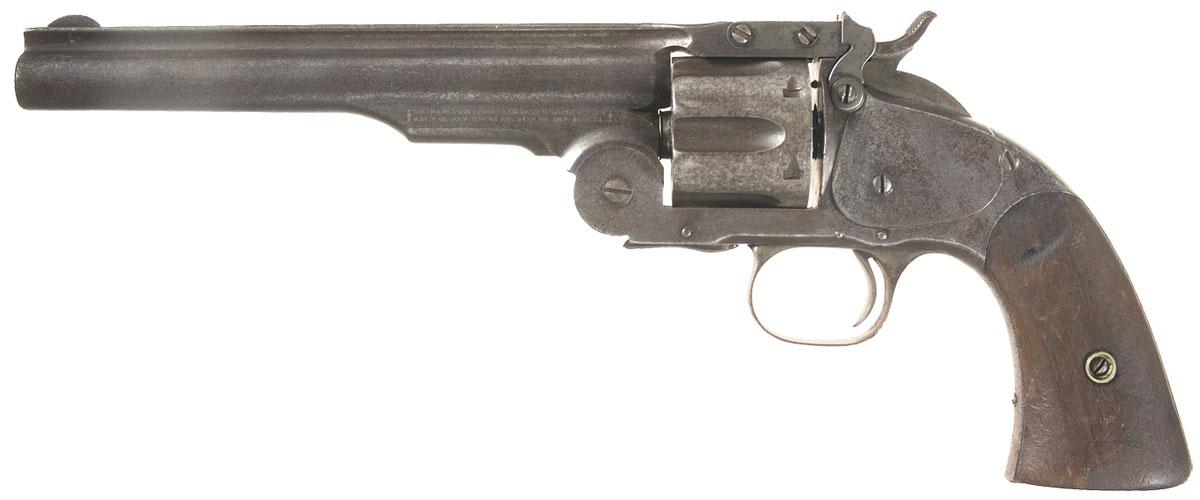 Produced in 1875. Standard markings with "US" on butt, "L" marked cylinder, "L" and "P" marked barrel, faint cartouche on left grip, extractor needs work.