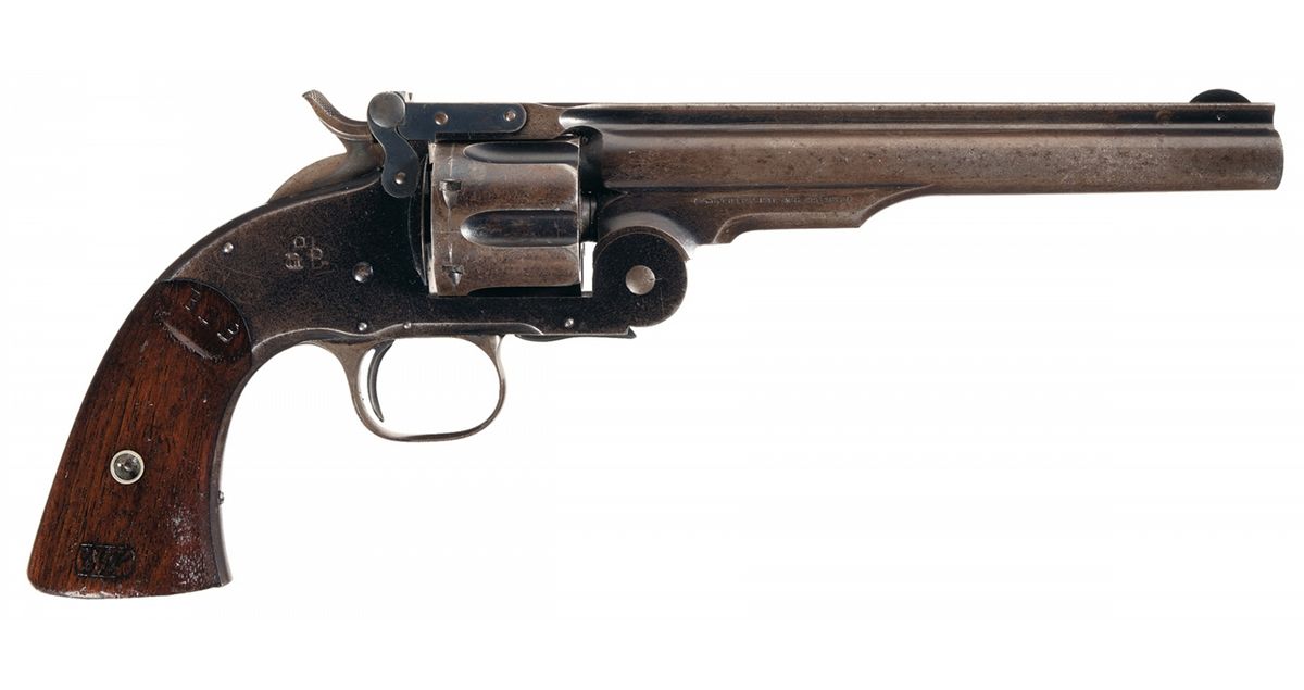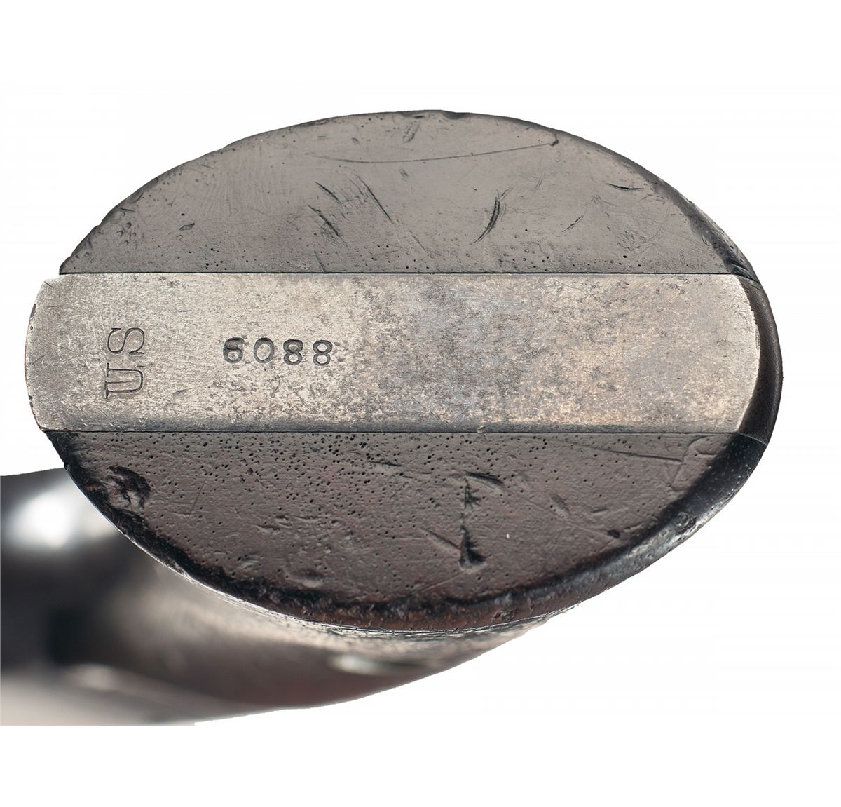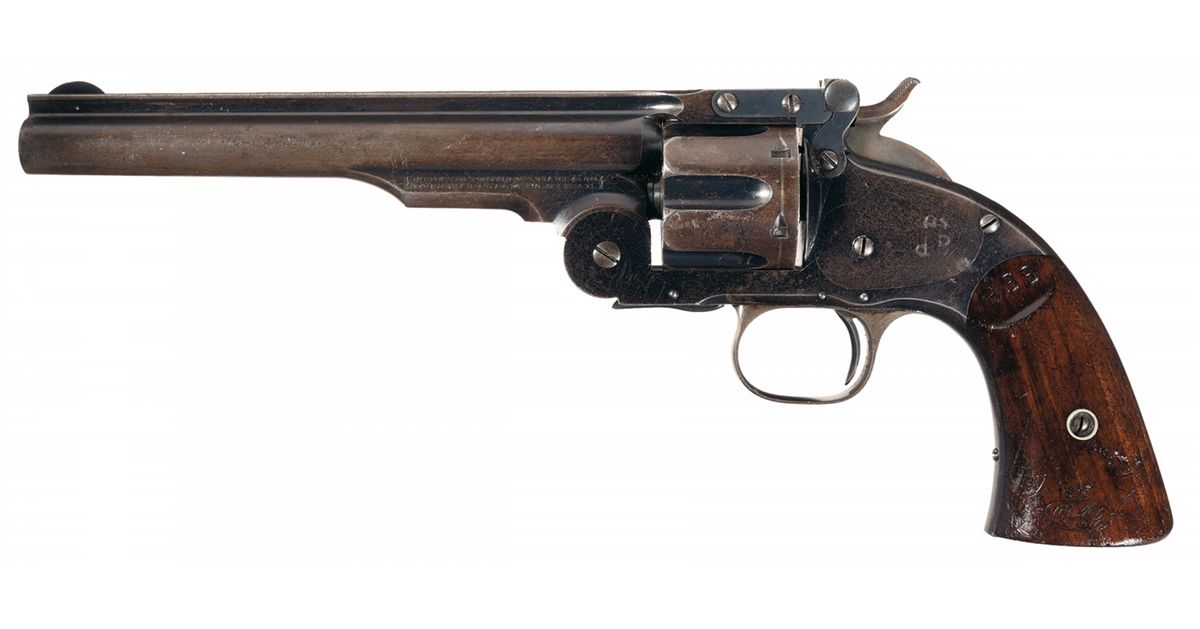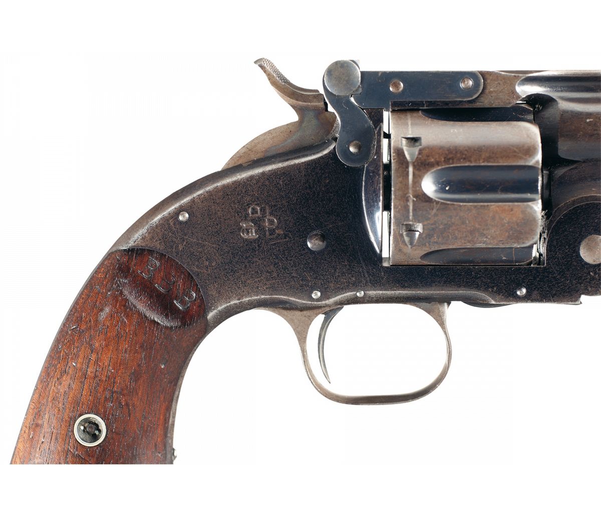Manufactured for the U.S. military circa 1876-77 with a total production of approximately 5,934. The revolver is marked with the two line address/patent dates on the left side of the ejector housing flanked by elongated Maltese crosses. The right side of the ejector housing is marked "+SCHOFIELD'S PAT. APR. 22D 1873+". The butt is marked "U.S." along with the serial number "8809". The rear cylinder face is stamped with the matching serial and Ordnance sub-inspector's "E" and "P", which are also marked on the bottom flat of the ejector housing. Each side of the frame is marked with three period "B"s in a pattern and "10" is stamped into the top of the back strap. The grips are smooth walnut and the Ordnance inspector's script initials cartouche "DAL" under the date "1877" on the left side and "CW" on the right side. The matching serial number is stamped on the inside of the right panel and three "B"s are stamped into the top of each panel. The significance of the "B" markings is unknown. Many Schofield revolvers were issued to the 4th Cavalry which saw service in the "Geronimo Campaign", and the famous 9th and 10th U.S. Cavalry comprised of the "Buffalo Soldiers" stationed in the American Southwest. People such as the James Brothers, Cole Younger, U.S. Marshall Bill Tilghman and the Chief Scout for Custer, "Lonesome Charley" Reynolds, were known to carry a Schofield revolver.