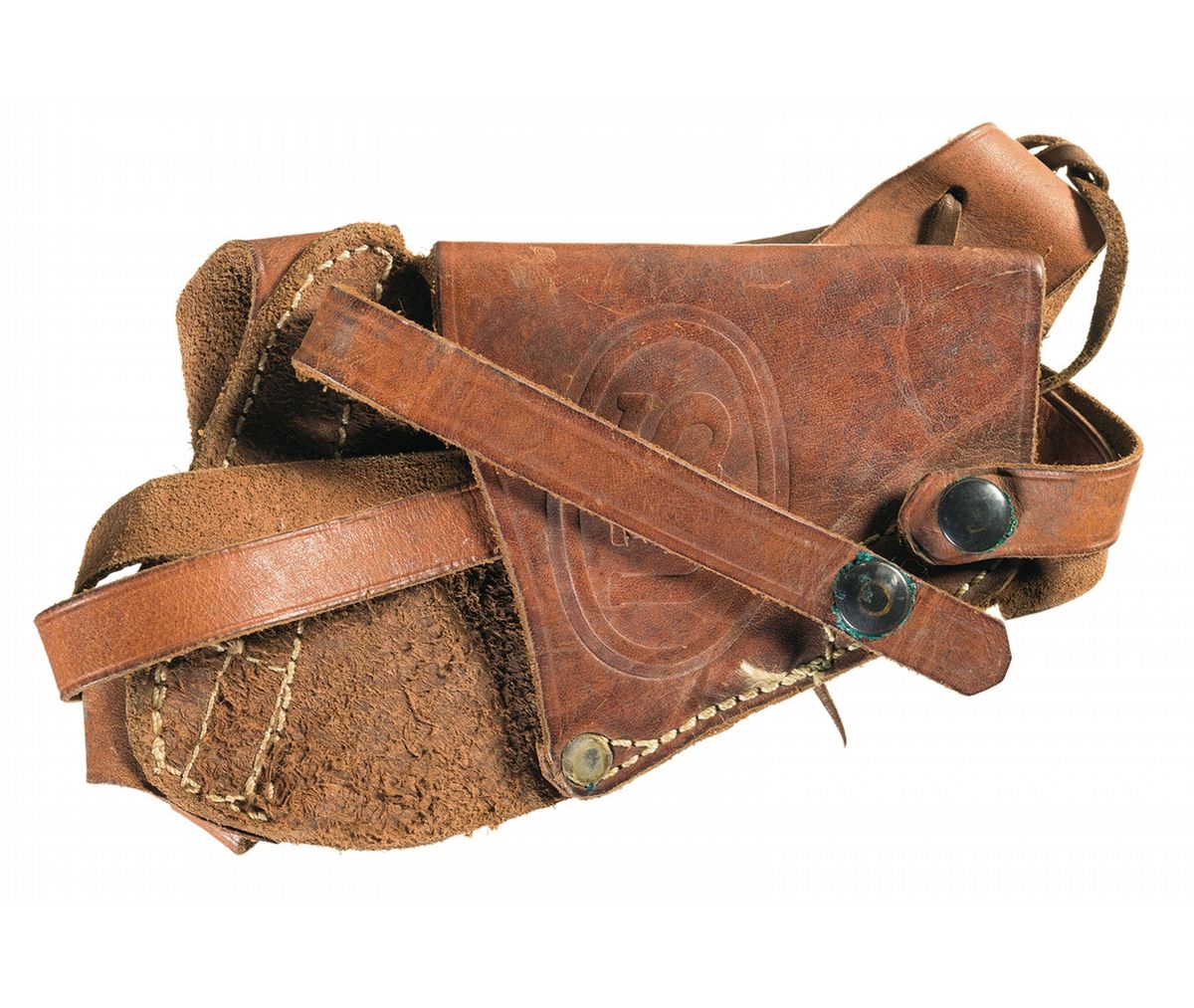 Excellent. The revolver retains 98% of the original parkerized finish, with mild edge wear, handling marks, and sub-surface pitting. Bright case colors are present on the trigger and hammer. The grips are also excellent, with a few small chips around the edges and light dings. The holster is good, possibly a field-made item using a U.S. pistol or revolver holster as raw material. Mechanically excellent.
