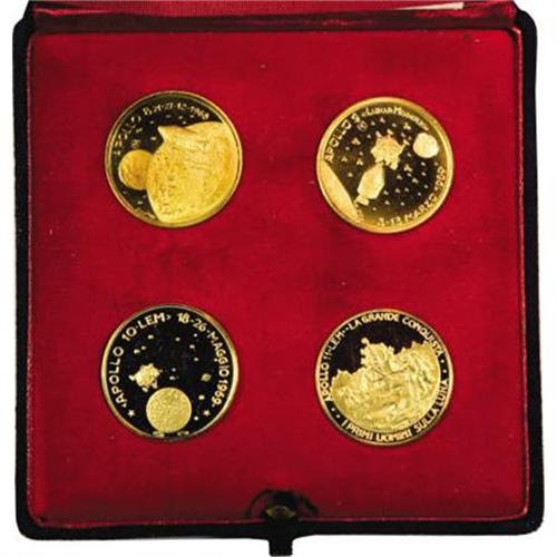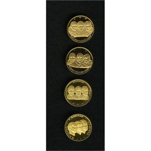 <B>U.S. Space Commemorative Apollo 8-11 Gold Medal Set of Four.</B></I> Gold, 25 mm, 10 gm, .900 fine medals struck in Italy in proof quality to commemorate the U.S. space program and the accomplishments of the Apollo program. The group consists of four gold medals each commemorating the feats of Apollos 8, 9, and 10, and the special Apollo 11 landing on the moon in July 1969. The set includes the original case of issue along with a certificate from the company that manufactured the medals, and a flyer advertising the mintage of only 2,000 sets. The gross weight of the group is 40 gm or 1.28 oz of gold, which equals 1.15 oz pure gold.<BR><BR><b>Shipping:</b> Coins & Currency (<a target="_blank" href="http://www.heritageauctions.com/common/shipping.php">view shipping information</a>)