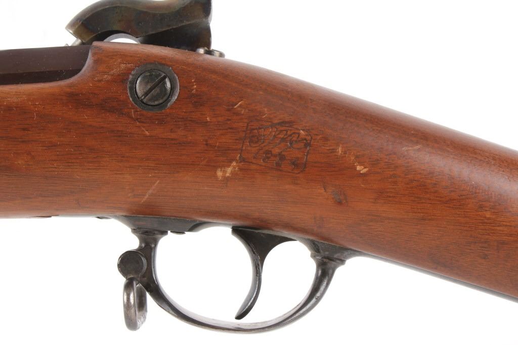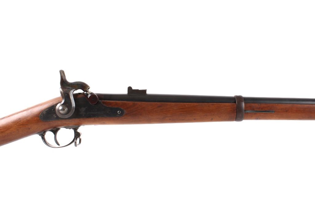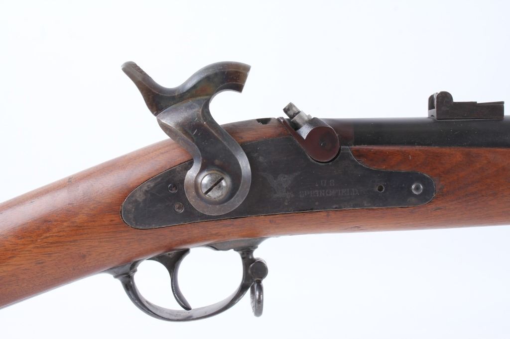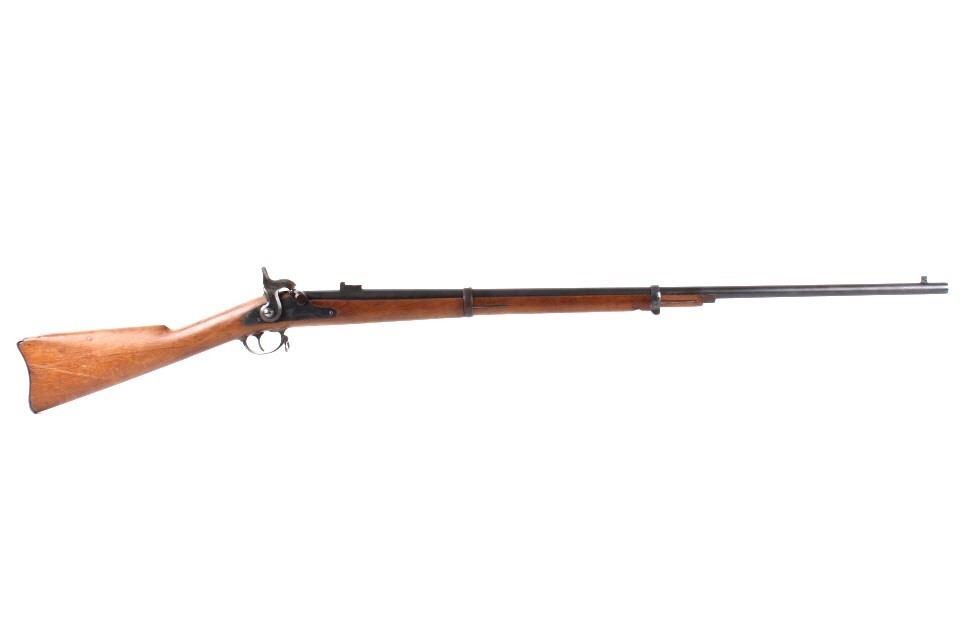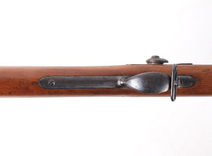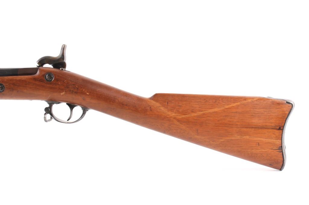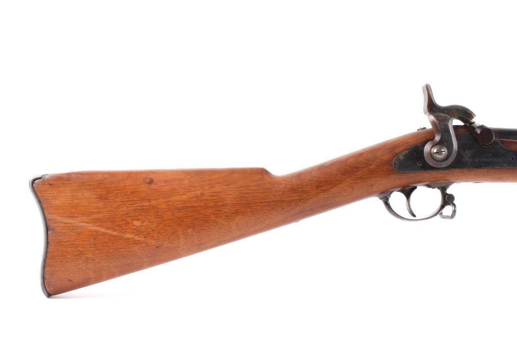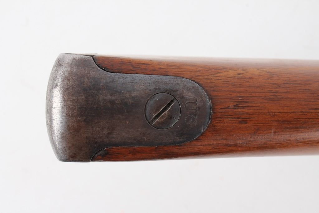Included in this lot is a U.S. Springfield 1961 variant percussion rifle. This U.S. Springfield variant utizlies a 35 ½” barrel chambered for the .58 Minié ball. The Minié ball is a type of muzzle-loading spin-stabilized bullet for rifled muskets named after its developer, Claude-Étienne Minié. Prior to the Minié ball, balls had to be jammed down the rifle barrel, sometimes with a mallet, and after a relatively small number of shots, gunpowder residue built up in the spiral grooves, which then had to be cleaned out. The development of the Minié ball was significant, because it was the first projectile that was small enough to be easily put down the barrel of a rifled long gun. Both the American Springfield Model 1861 and the British Pattern 1853 Enfield rifled muskets, the most common weapons used during the American Civil War, used the Minié ball. The Springfield rifle includes any of the several rifles that were standard infantry weapons of the U.S. Army most of the time from 1873 to 1936, all taking their name from the Springfield Armory, established at Springfield, Mass., by the U.S. Congress in 1794. The armory had produced smoothbore muskets from its earliest days, and between 1858 and 1865 it turned out more than 840,000 .58-calibre rifled muskets. This rifle shows good condition for its age. The right lock plate shows the standard U.S. Springfield and eagle stamping as well as a nice aged blued finish. The crescent metal butt plate on this firearm show the U.S. stamping on the top of the plate near the screw head. The left of the stock shows a cartouche with the date 1884. Toward the bottom of the tang on the stock is an additional cartouche. The barrel has been either replaced or reblue’d during the rifles life time. No Serial Number. This firearm qualifies as an Antique, and does not require FFL Transfer or NICS Background Check.