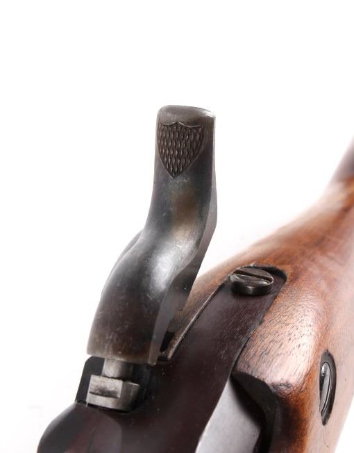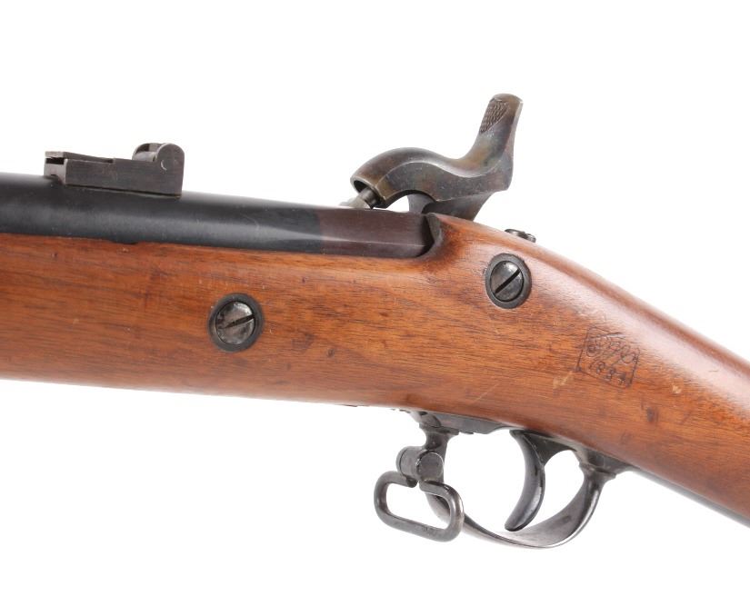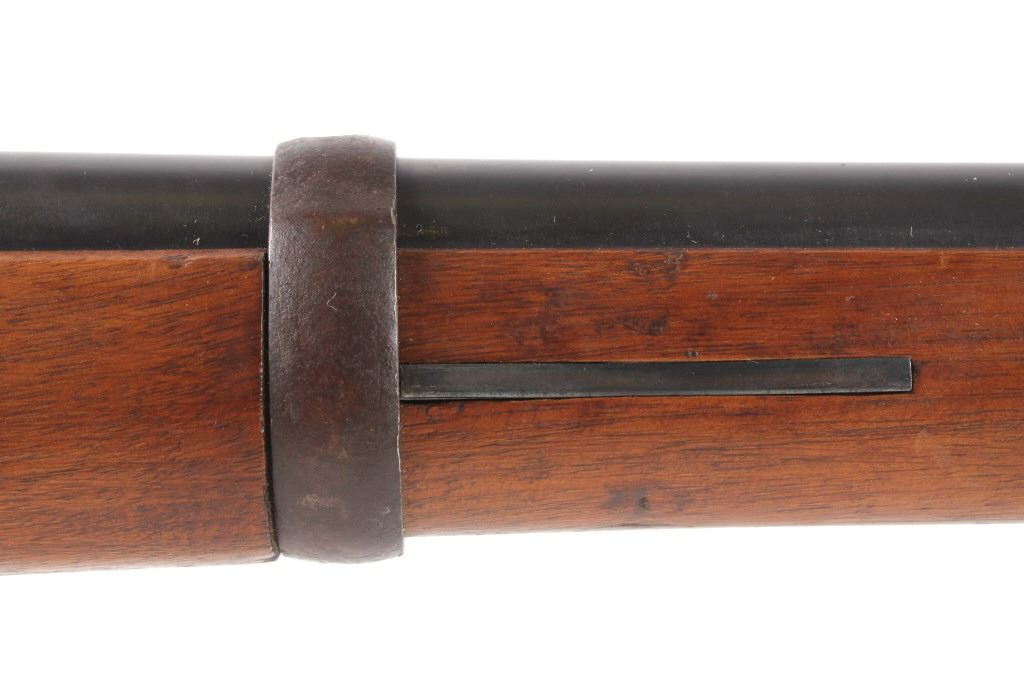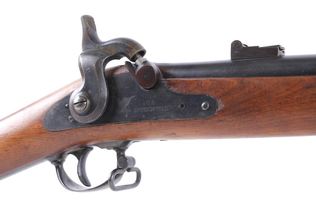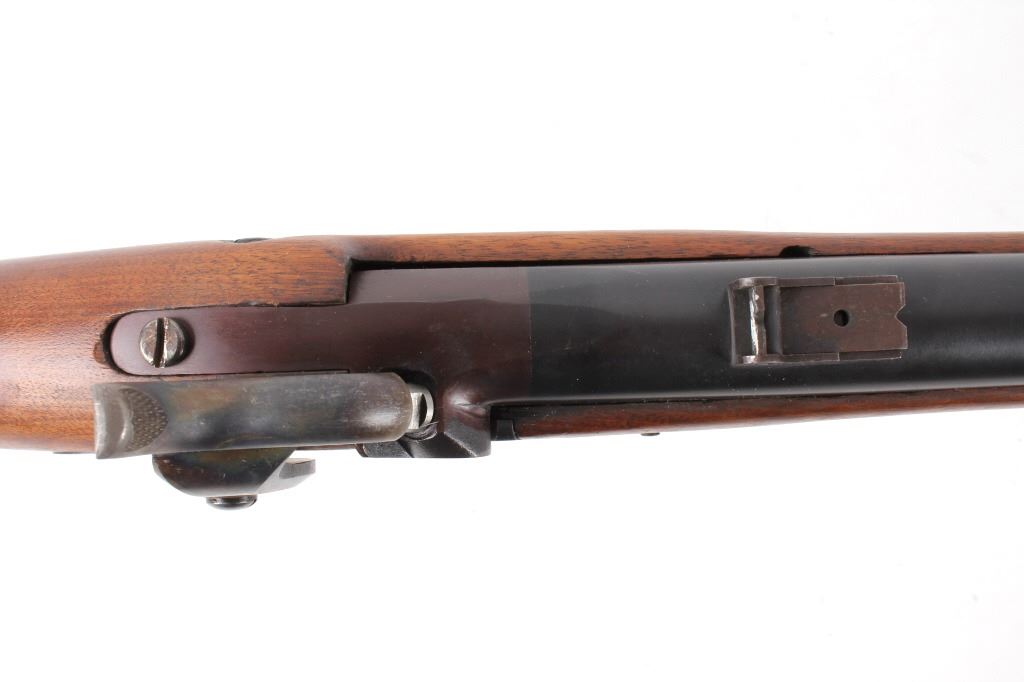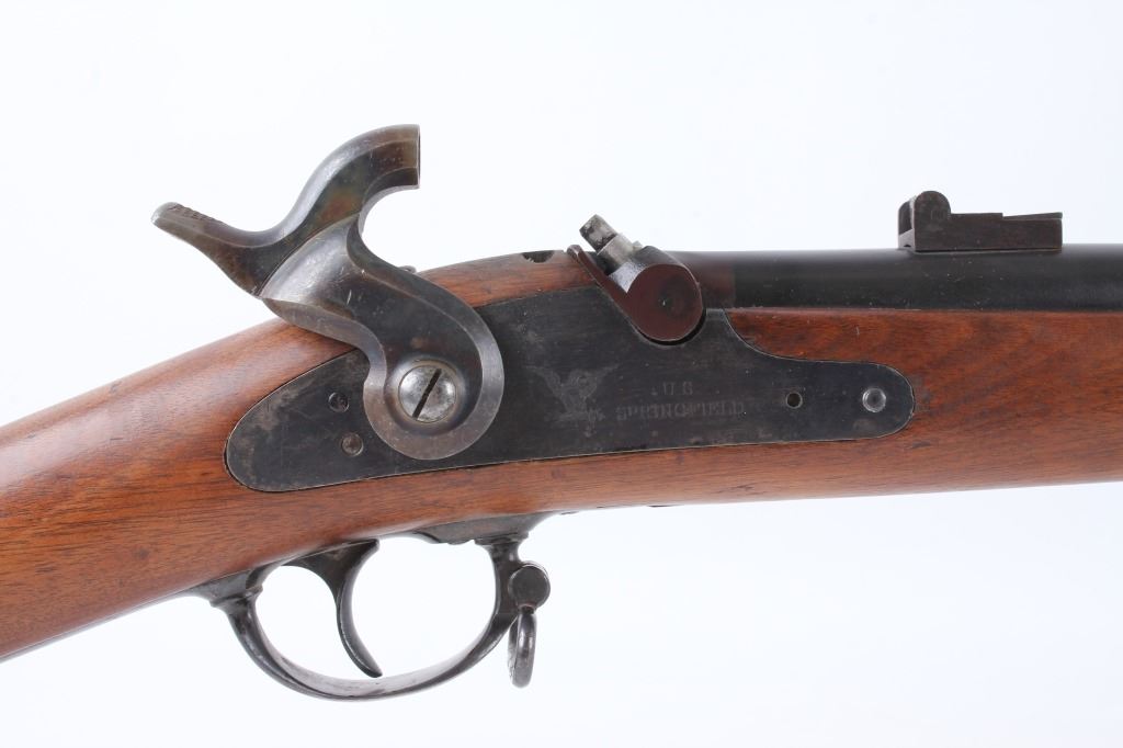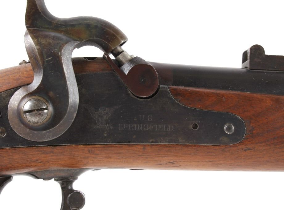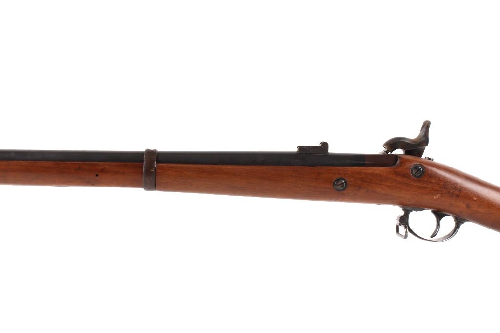 Included in this lot is a U.S. Springfield 1961 variant percussion rifle. This U.S. Springfield variant utizlies a 35 ½” barrel chambered for the .58 Minié ball. The Minié ball is a type of muzzle-loading spin-stabilized bullet for rifled muskets named after its developer, Claude-Étienne Minié. Prior to the Minié ball, balls had to be jammed down the rifle barrel, sometimes with a mallet, and after a relatively small number of shots, gunpowder residue built up in the spiral grooves, which then had to be cleaned out. The development of the Minié ball was significant, because it was the first projectile that was small enough to be easily put down the barrel of a rifled long gun. Both the American Springfield Model 1861 and the British Pattern 1853 Enfield rifled muskets, the most common weapons used during the American Civil War, used the Minié ball. The Springfield rifle includes any of the several rifles that were standard infantry weapons of the U.S. Army most of the time from 1873 to 1936, all taking their name from the Springfield Armory, established at Springfield, Mass., by the U.S. Congress in 1794. The armory had produced smoothbore muskets from its earliest days, and between 1858 and 1865 it turned out more than 840,000 .58-calibre rifled muskets. This rifle shows good condition for its age. The right lock plate shows the standard U.S. Springfield and eagle stamping as well as a nice aged blued finish. The crescent metal butt plate on this firearm show the U.S. stamping on the top of the plate near the screw head. The left of the stock shows a cartouche with the date 1884. Toward the bottom of the tang on the stock is an additional cartouche. The barrel has been either replaced or reblue’d during the rifles life time. No Serial Number. This firearm qualifies as an Antique, and does not require FFL Transfer or NICS Background Check.