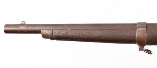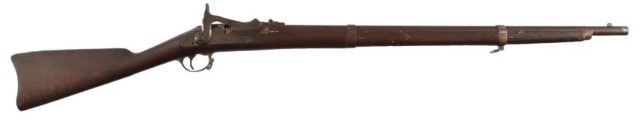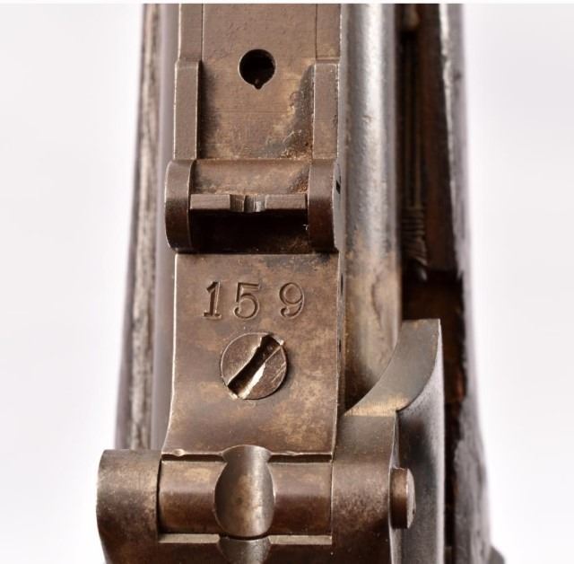 First model, with eagle cartouche. White marked "5" in left stock, "11" and "Col. B.B." near tang, missing original ramrod and trapdoor lever. Stock numbered 173 near buttplate, stamped 159 on trapdoor hinge.