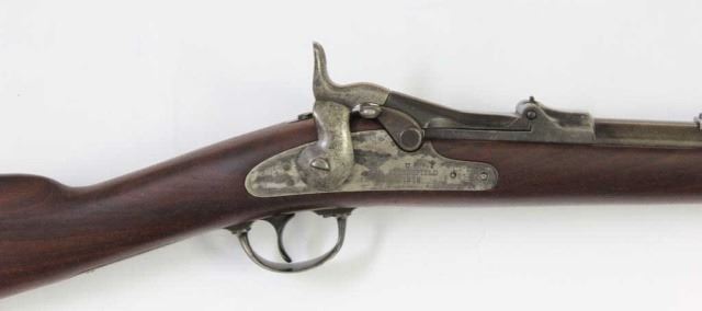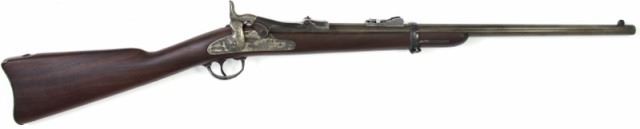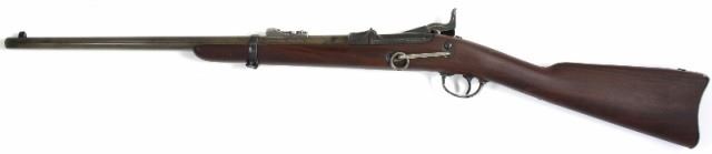 U.S. Springfield 1873 .45-70 SN11XXXtrap door carbine, 22" barrel, blued and case hardened finish with walnut stocks, no provision for cleaning rod in buttplate or stock, barrel shows blue drifting to plum, barrel band bright blue, breechblock darkblue to black with Model 1873 over Eagle, walnut stock is refinished with sharp ESA cartouche, the hammer and lock a mottled silver gray color, action and bore very good. Antique. Est. 1500-2000