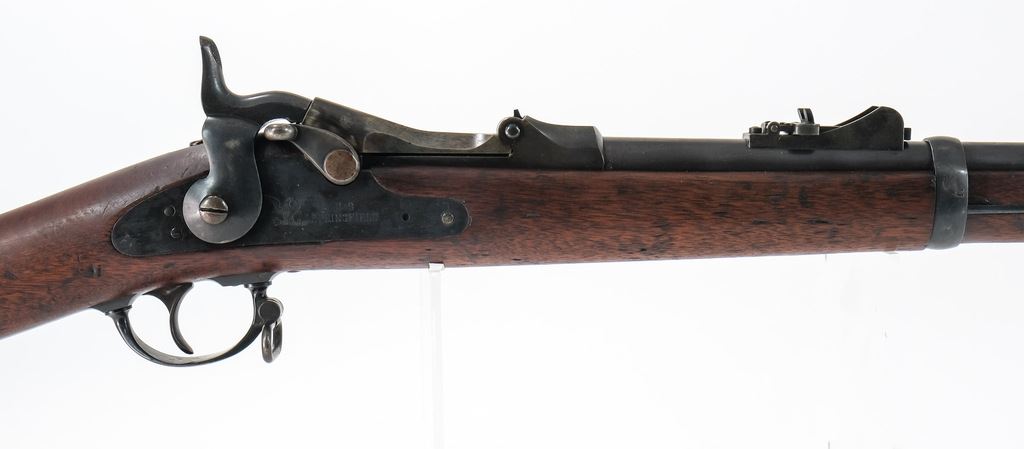 U.S. Springfield model 1873 trapdoor rifle chambered in .45-70. This features a 32.6" rifled barrel marked with "V / P / Eagle". The breach block which still exhibits a hint of case coloring is marked "U.S. MODEL 1873". The lock plate which still retains a great deal of original blue is distinctly marked U S SPRINGFIELD" along side the Federal Eagle. The hammer also retains a great deal of original blue. The butt plate is marked "US". The stock bears a clean "SWP / 1882" cartouche and circle P behind the trigger guard. Overall this is an extremely nice example retaining a great deal of original finish and all appropriate arsenal markings. Antique.