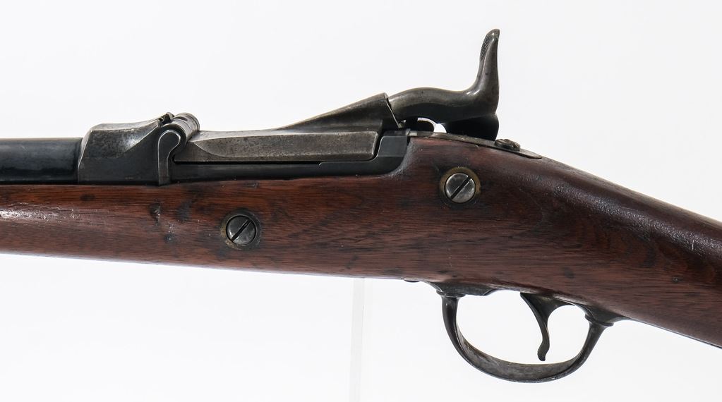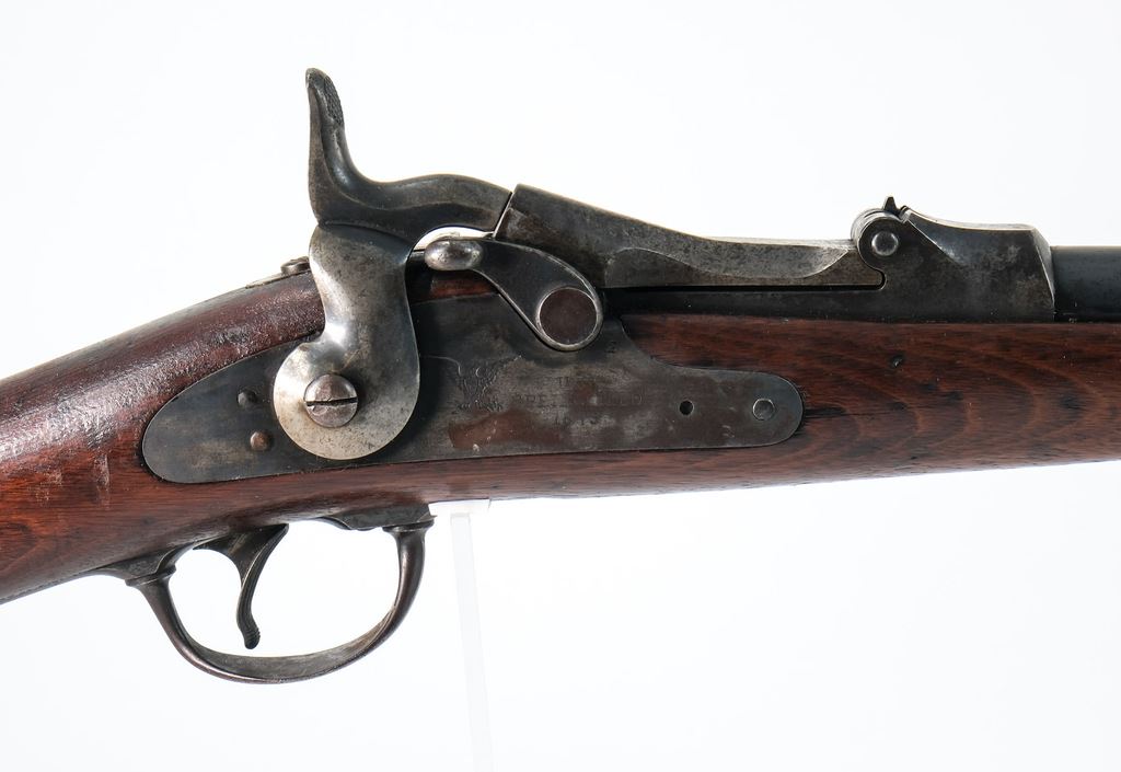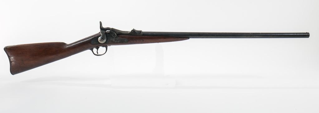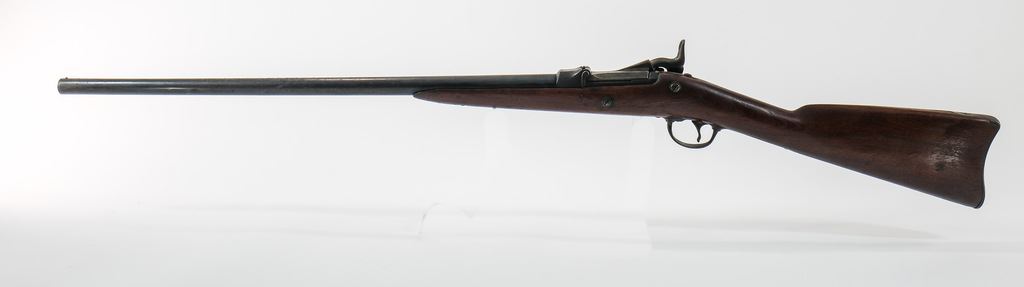 U.S. Springfield model 1881 Trapdoor "Forager" Shotgun. This 20 gauge shotgun with serial number 1122, is one of only 1,376 examples produced. This variation of the trapdoor was used by hunters and scouts primarily at western outposts in the late 19th century through the early 20th century. The barrel shows a good deal of original bluing with some surface oxidation that should clean up. There remains a small amount of case coloring on the breech. The lock plate is a mix of silver and blue and is stamped "U.S. / SPRINGFIELD / 1873" along side the Federal Eagle. Receiver has been enlarged to accept a 20 gauge brass shell. The breech block has only the date “1881” stamped in italic style numerals. Mechanics are tight and function as expected. Overall a very nice and solid example of an exceptionally rare variation of a military marked trapdoor rifle. Antique.