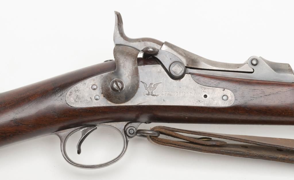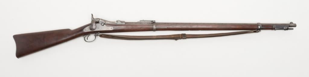 U.S. Springfield 1884-dated Trapdoor ramrod variation rifle, .45-70 cal., 32-1/2” barrel, blue and case hardened finish, wood stock, leather sling, #526252 in overall very good + condition showing plum brown patina on barrel andconsiderable original case color on action and lockplate; very good bore, crips action and markings; very good + stock. (Antique). Est.: $500-$1,000.