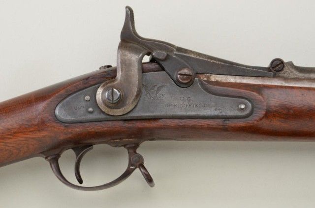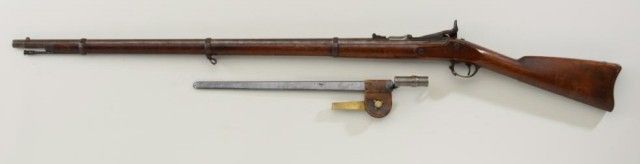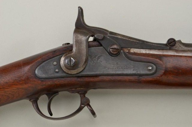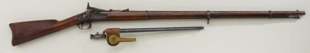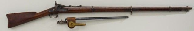 U.S. Springfield Allen Conversion breech  loading trapdoor rifle, .50 cal., 36-1/2”  barrel, blue finish, wood stock, sling  swivels, iron cleaning rod, #NVSN;  accompanied by a socket bayonet with metalscabbard and leather hanger with US marked  brass hook.  This gun is in overall very good  condition showing a brown patina on barrel  and muted blue finish on trapdoor and  lockplate; very good bore, crisp action,sharp markings including 1864 date on  lockplate and 1866 date on trapdoor with  eagle head proof; wood stock is overall very  good with the usual scattered mars and  scratches from storage; sharp inspectorscartouche on left side of stock above the  trigger guard; bayonet, scabbard and hanger  also in very good condition.  Est.:   $800-$1,600.