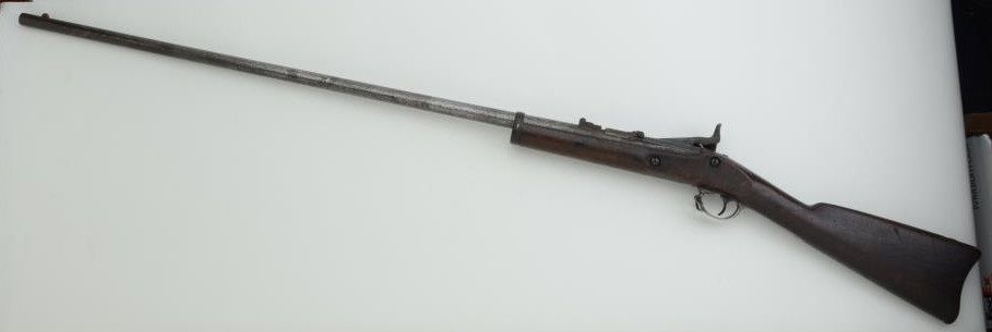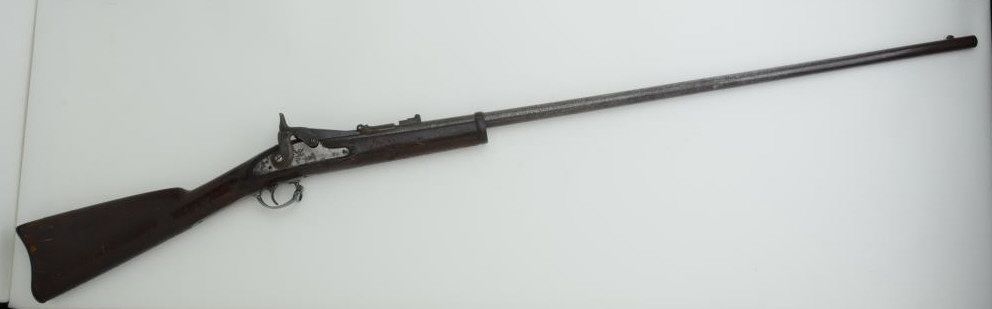 U.S. Springfield Allin-type conversion rifle, .50 cal., 36-1/2” barrel, wood stock cut down to back barrel band, #NVSN. This gun is in overall fair condition as modified, trapdoor is dated 1866 with eagle head proof, good action, fair bore, well-worn wood stock. From an old estate. Est.: $150-$300.