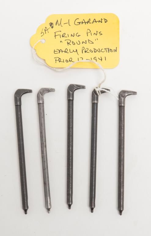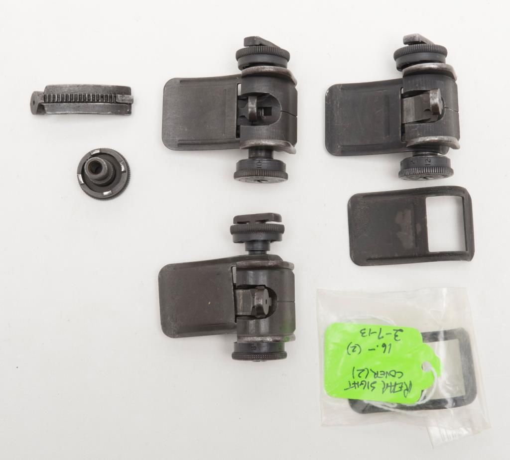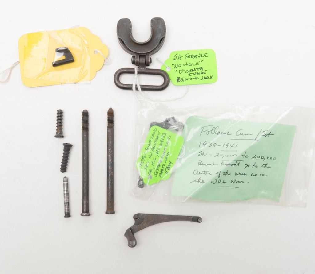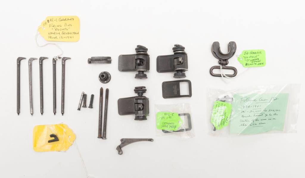 U.S. Springfield Armory Garand small parts lot including 3 rear sight assemblies, 5 round early production (prior to 12/41) 5 firing pins, 2 rear sight covers, very early follower arm (1939-41), “no hole” ferrule plus other misc. parts; all from a discriminating serious collector’s workbench with individual tags on many pieces indicating where part was obtained, etc. Est.: $300-$500.