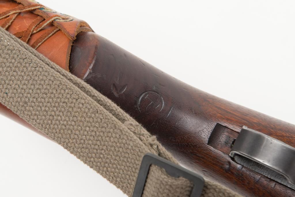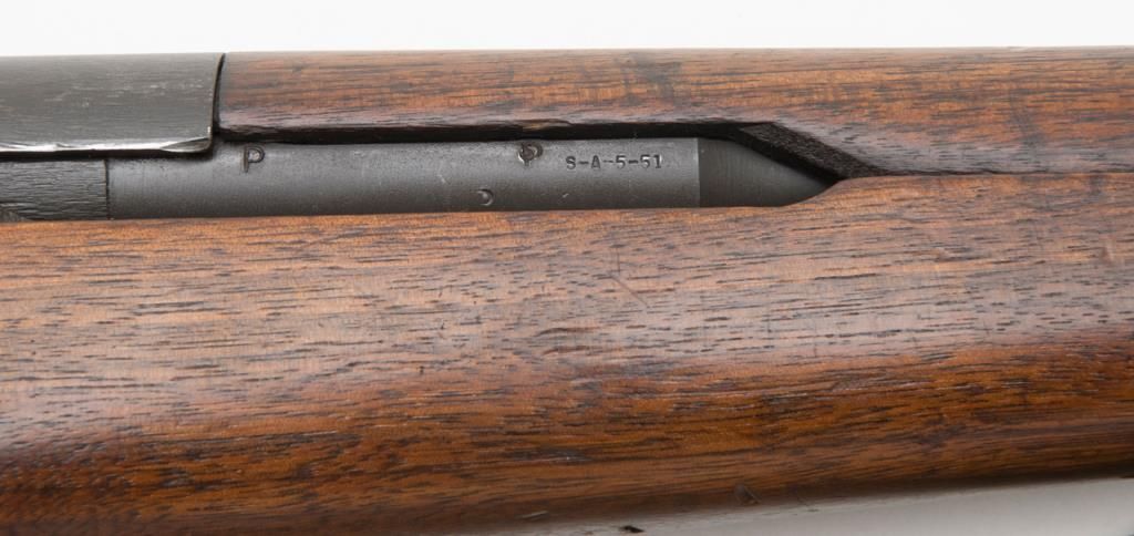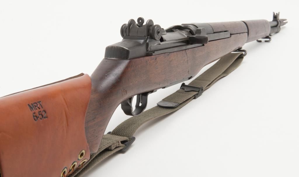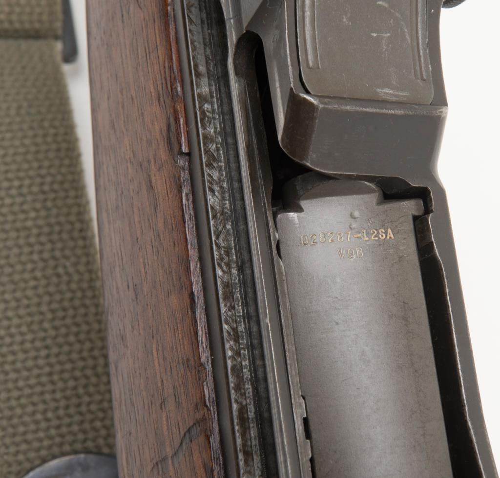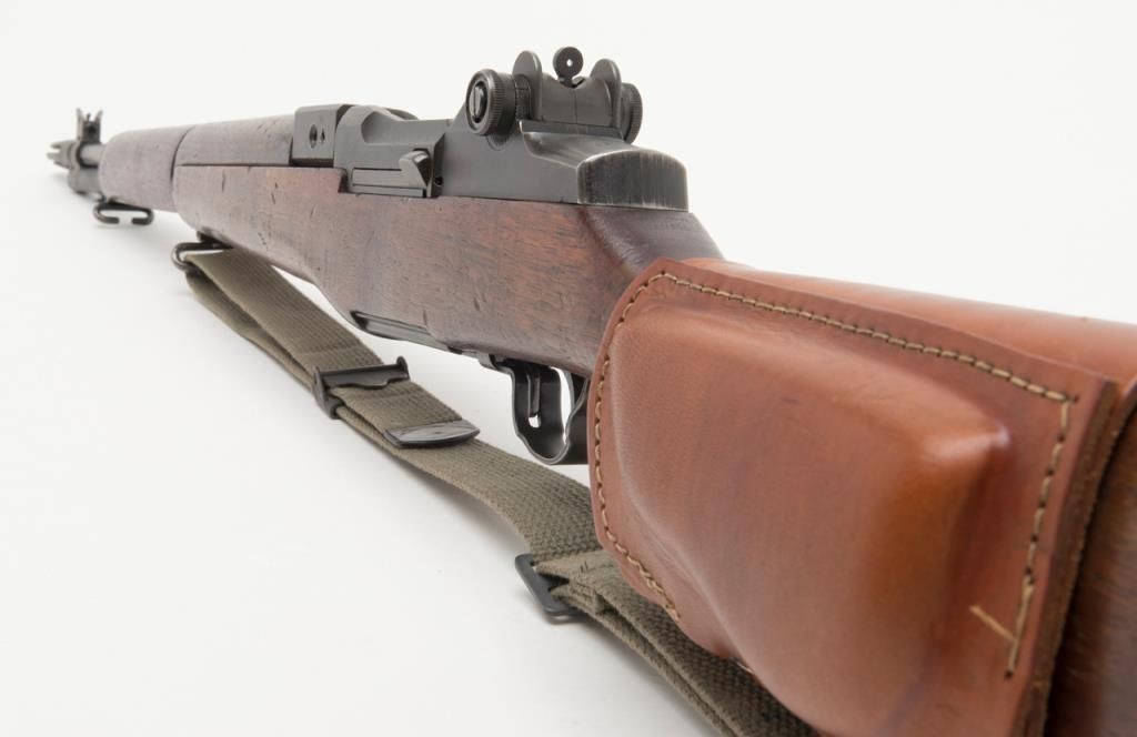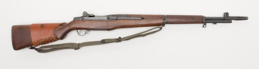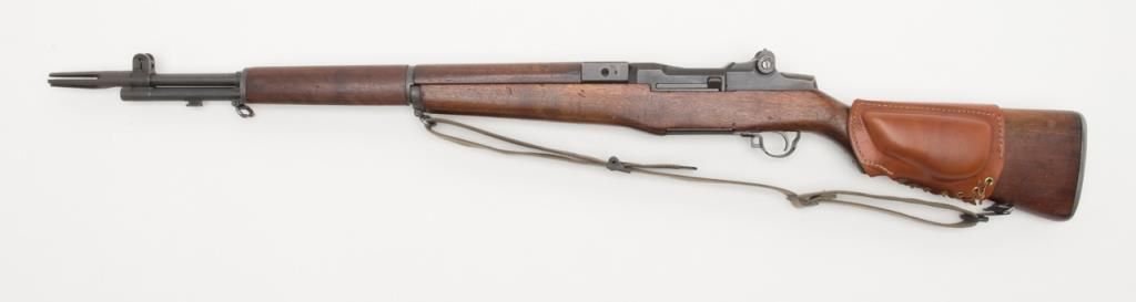 U.S. Springfield Armory M1 Garand Sniper rifle with base set-up for scope on breech area of barrel in front of receiver, .30 cal., 24” barrel, military finish, wood stock with padded leather cheek piece attached and marked “MRT 6-52”,military open end slotted muzzle compensator, green woven sling, #411876 in overall very good to near fine condition displaying the majority of its military finish, very good to fine bore, crisp action and markings, very good stock withscattered mars and scratches from carry and storage including a cluster of small, shallow nail head-like dings on the right rear side of the butt stock; circle P proof visible. A very nice example of a Garand sniper that can be completedwith the addition of a correct M84 scope and mount. (C&R/PPT). Est.: $700-$1,400.