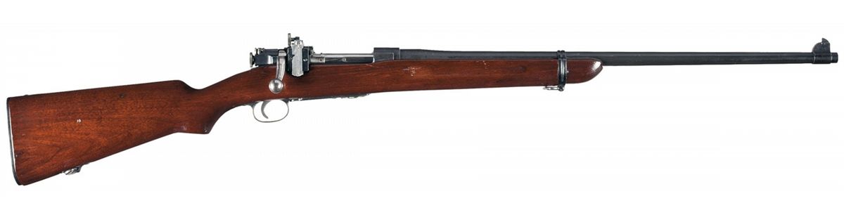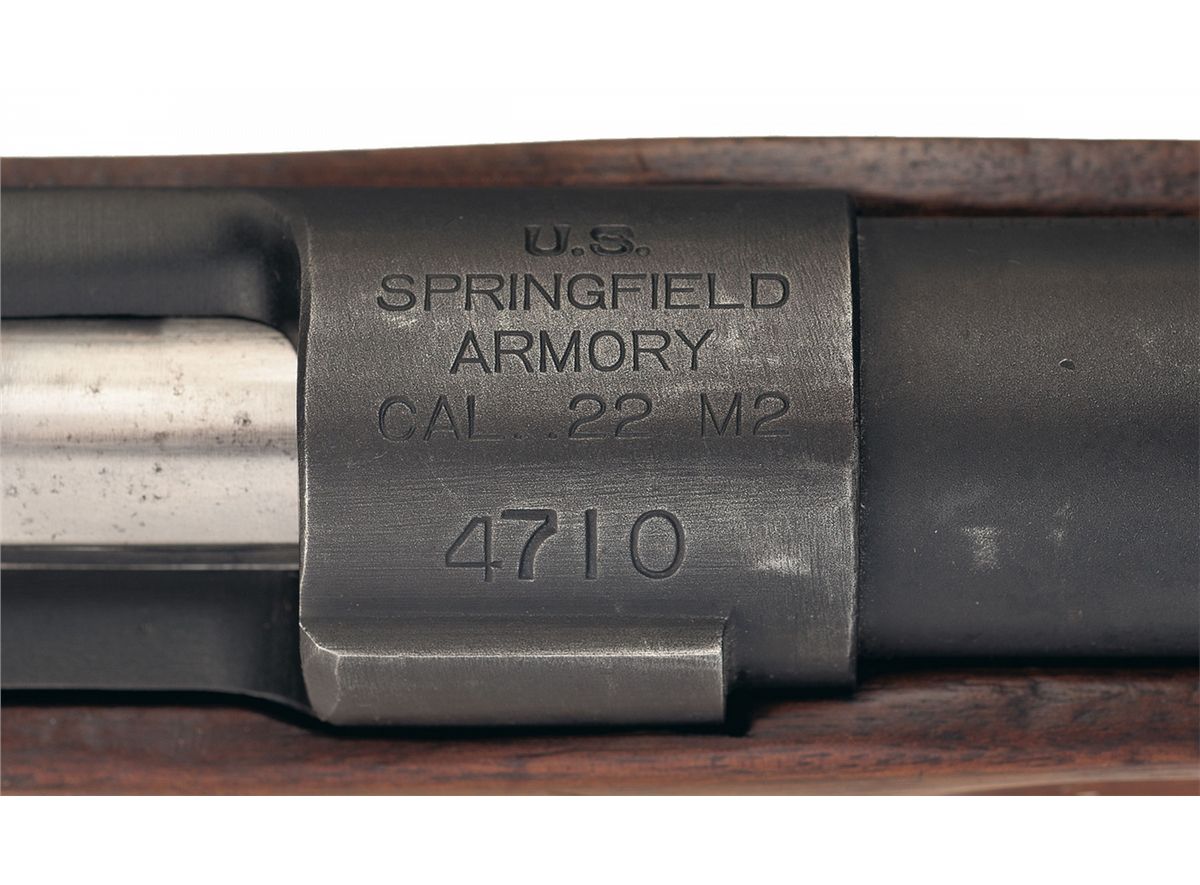 Fixed blade front sight and fully adjustable Lyman rear peep sight. The barrel is marked "S A/flaming bomb/11-34" and the at the rear left side "LONG RIFLE/CART'GE ONLY.". The receiver has the standard markings and the polished bolt is numbered to another gun and marked "NS/M2" on the base of the bolt knob. Mounted on a smooth walnut pistol grip stock with finger grooves on the forend, marked "M2" on the grip cap area, sling swivels and a checkered steel buttplate. With a shipping box from Rock Island Arsenal numbered to the gun.