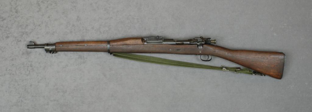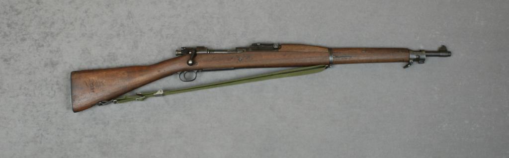U.S. Springfield Armory Mark I Model 1903  bolt-action military rifle, .30-06 cal., 24”  barrel, military mat black finish, barrel  marked “8-19”, “S.A.” and shows a flaming  bomb proof, wood stock, olive green wovensling, #1097943. This gun is in overall very  good to fine condition showing considerable  military finish remaining; good bore, crisp  action and markings, good to very good wood  with “87327” stamped on right side of buttstock; old repair to top rear portion of butt  stock, scattered nicks and mars from carry  and storage; last four digits of serial  number etched on the top of the bolt handle.   Est.:  $500-$900.