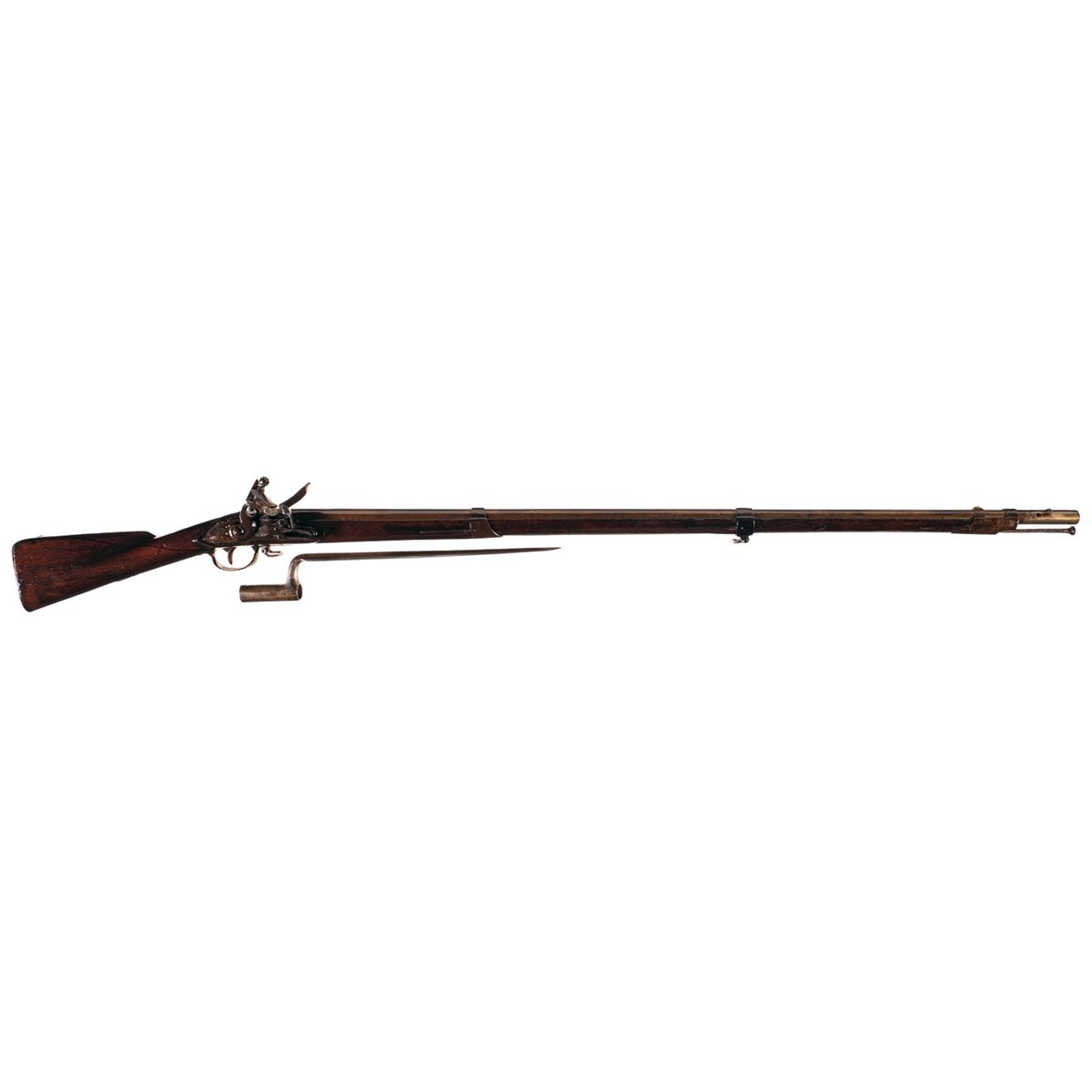 This is a Type III Flintlock Musket with the integral forged flash pan and trigger guard with rounded finials. Brass blade front sight on the barrel band, with a bayonet band near the muzzle "P/Eagle head/V" on the left side of the breech and "US" on top at the breech. The lock plate is dated 1812 and has a script "US" over the Eagle/Shield motif above "SPRINGFIELD" in an upward curve. Smooth straight grip stock with three spring secured barrel bands, sling swivels and "1813" dated buttplate. Inspection marks are stamped behind the trigger guard. With "US" marked socket bayonet.