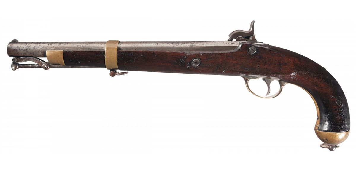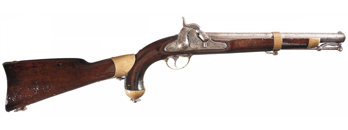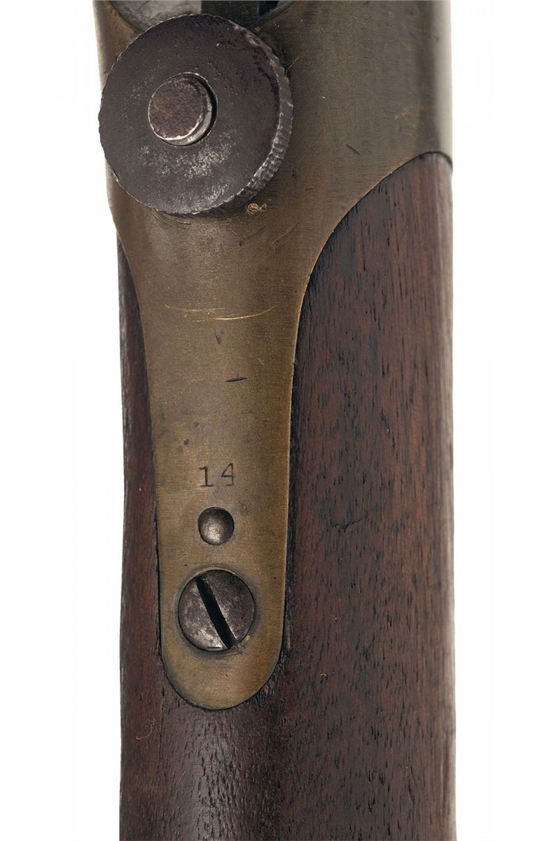 This is a very nice example of the unique and highly desirable Springfield Model 1855 Pistol Carbine with attachable stock. The pistol carbine features the Maynard self-priming device, a swivel ramrod with button head, clean out screw on the nipple bolster and a three leaf folding rear sight graduated to 400 yards. Springfield Armory manufactured 4,021 pistol carbines between 1855 and 1857. The Model 1855 Pistol Carbine was widely issued to the U.S. dragoon and cavalry regiments prior to 1861 and remained in limited service during the first years of the Civil War. The pistol-carbine has a "National Armory Bright" barrel, ramrod, lock plate and back strap. The pistol and stock mountings are all brass. The door of the Maynard magazine is stamped with the Springfield eagle and shield. The lock is dated "1856" behind the hammer and marked "U.S./SPRINGFIELD" ahead of the primer magazine. The barrel tang is dated "1855" and the left barrel flat has the "V/P/eaglehead" proof and inspection marks. The butt cap and stock hardware are both numbered "14". The stock buttplate is marked "U.S." ahead of the buttplate screw.