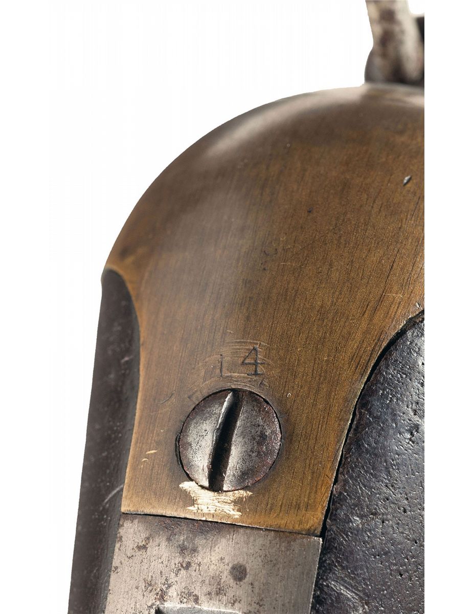 Condition: Good, with a mixed brown and gray patina overall, showing areas of pitting and scattered handling marks. The middle sight leaf has become detached. A dark patina has formed on the brass, with bright edges and a number of dents. The stock takedown nut is a slightly oversized replacement. The wood is fair with a number of dents and scratches. Mechanically in full working order, including the primer.