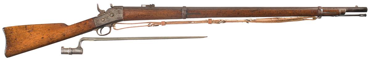 Manufactured from 1871 to 1872. Fixed front sight, folding ladder rear sight graduated to 900 yards and leather sling. Left side of receiver marked "MODEL 1871", with "U.S./ SPRINGFIELD/ 1872" on the reverse. The upper tang has the two line Remington patent dates. The stock wrist has a script "ESA" cartouche, with a "JCA" inscribed on the buttstock (left side). Complete with bayonet marked with the number "58" on the socket.