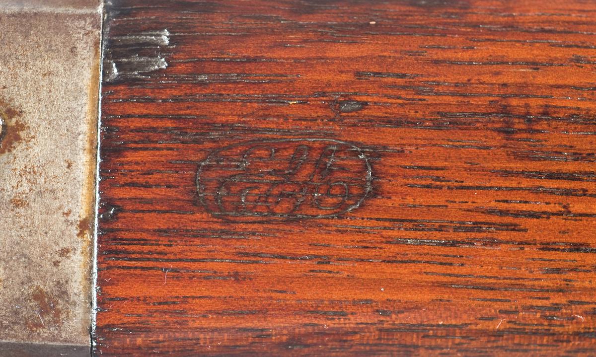 Condition: Very good. The barrel has a smooth dark brown patina, with a dark mottled patina on the frame. There is some minor spotting, with some minor pitting (mostly on the buttplate). The freshened wood is fine with a filled repair on the forearm (right side), some scattered minor gouges, and some minor dings and scratches. The bayonet is very good with a mottled gray patina with some minor pitting.