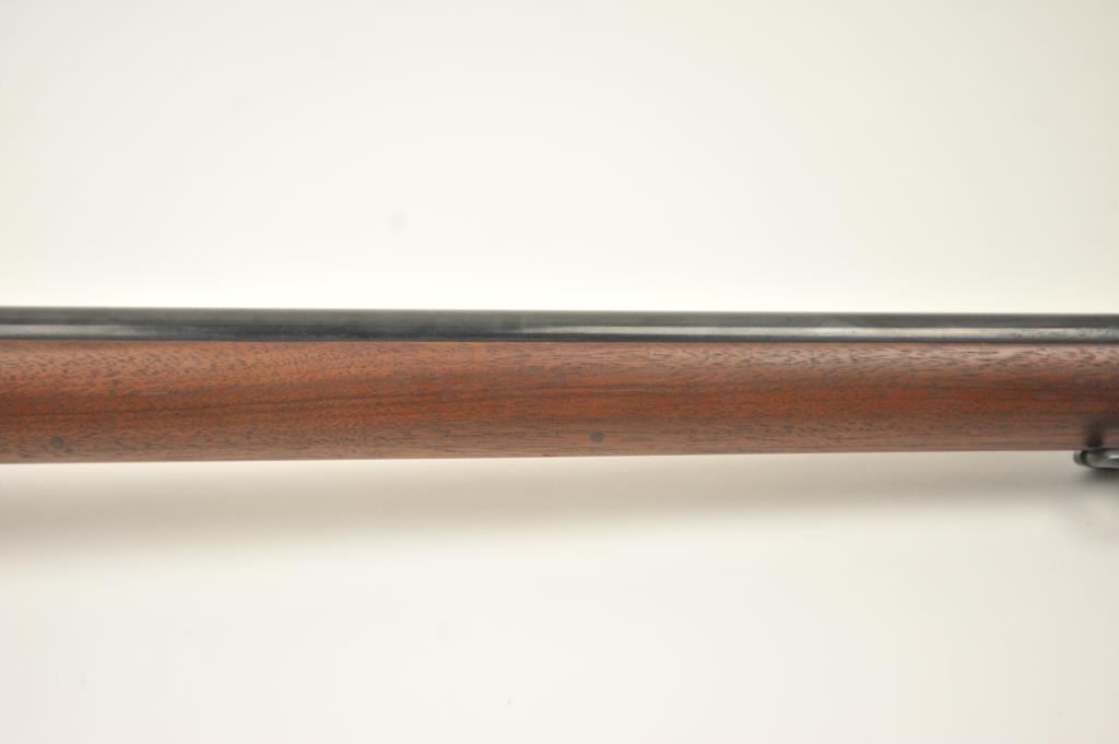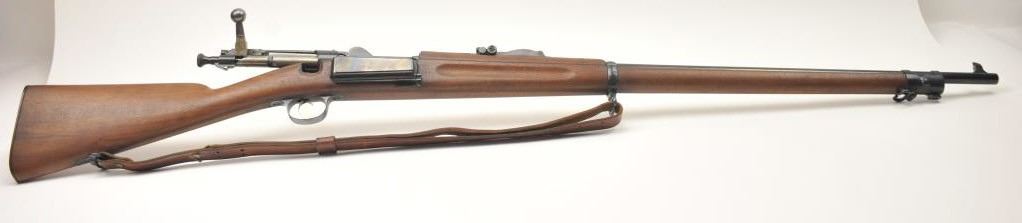 U.S. Springfield Armory Model 1896 Krag-Jorgensen bolt action rifle, .30-40 Krag caliber, Serial #372800. The rifle is in fine overall condition as re-finished with a 30” barrel. The rifle retains approximately93-96% of an old quality re-blue. The rifle has a ramped brass blade front sight and a military tangent style rear sight. The smooth wood stock is in very good condition with two crisp cartouches behind the triggerguard. The bore is fair and the action works well. The rifle includes sling swivels and a leather military style sling. Est.: $300-$600. (C+R).