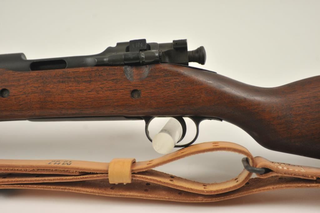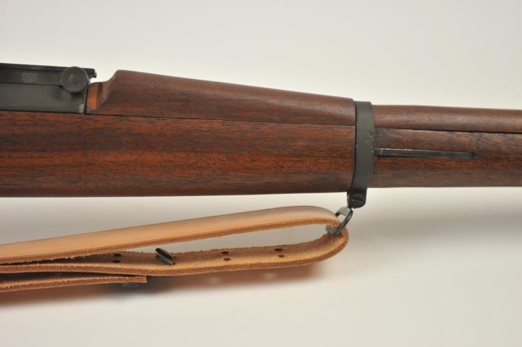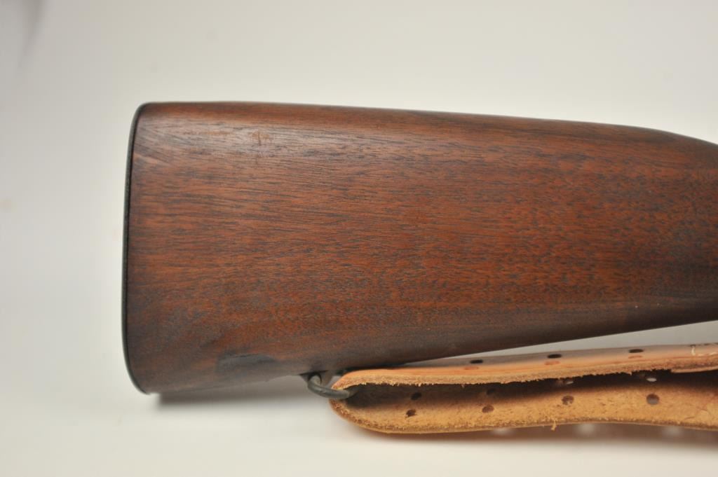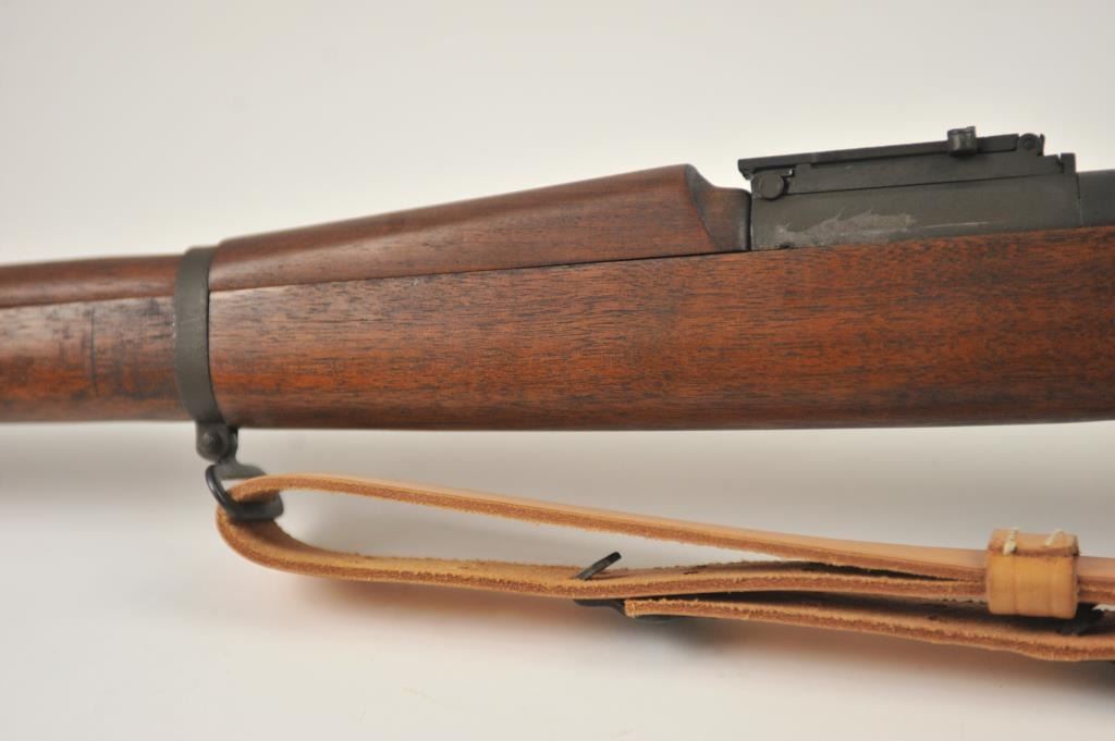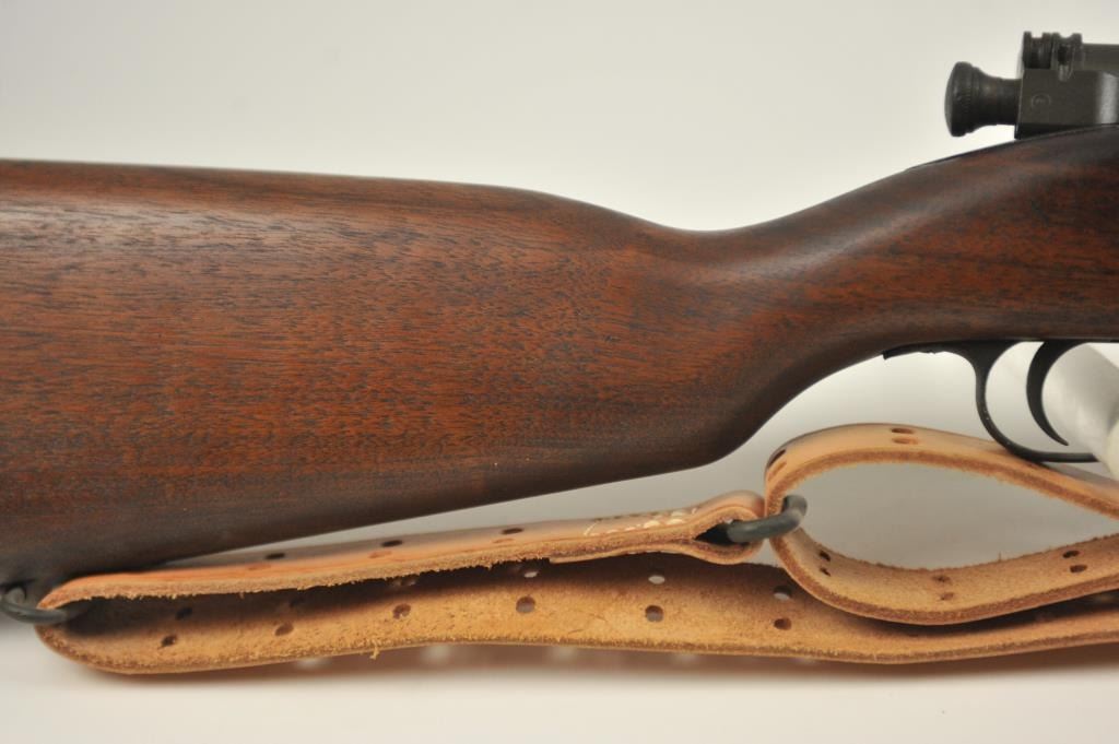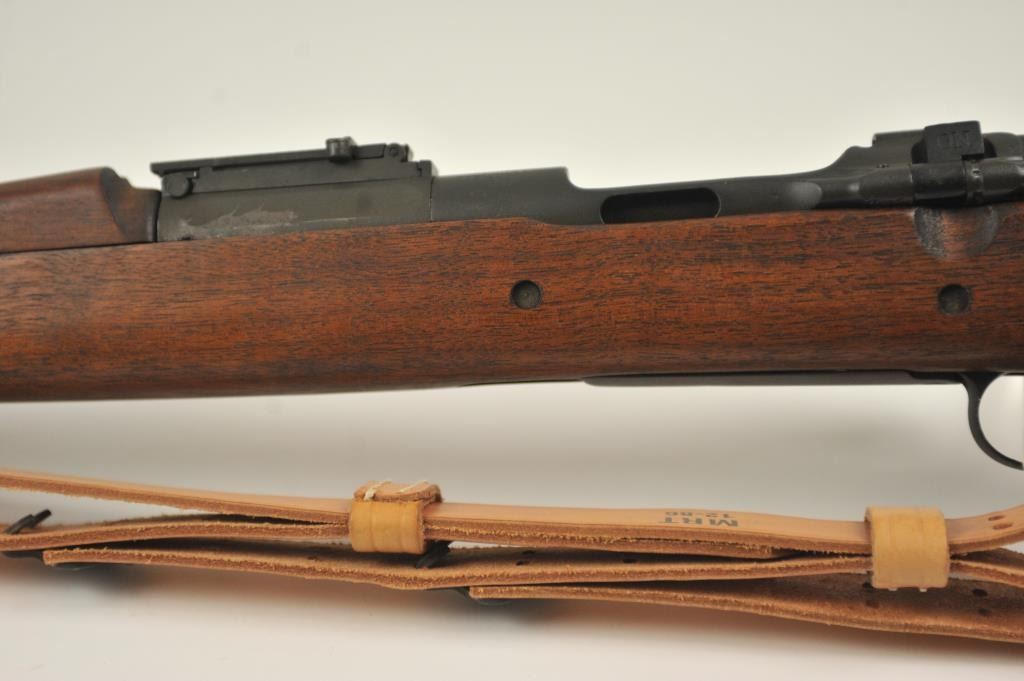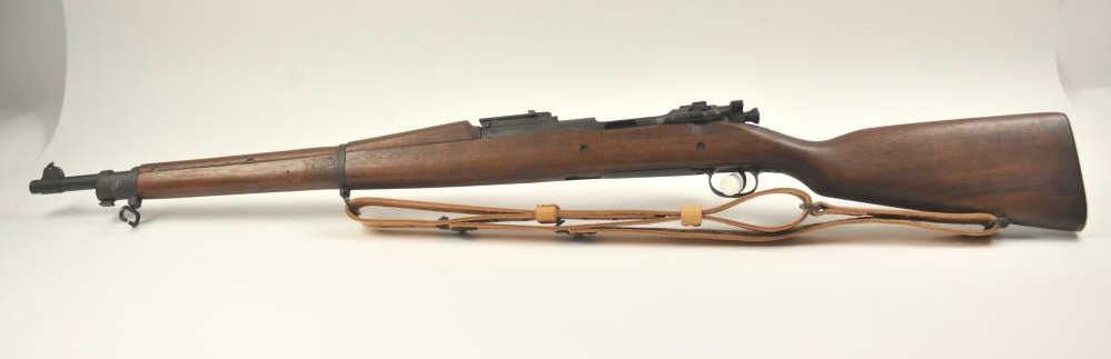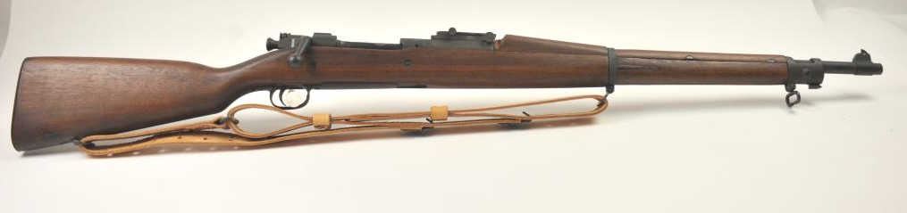 U.S. Springfield Armory Model 1903 Mark I, .30-06 caliber, Serial #1104034. The rifle is in fine overall condition as arsenal rebuilt with the cut-out for the Pedersen device. The rifle retains nearly all of themilitary parkerized finish. The barrel is RA marked and dated 11-43 with the flaming bomb emblem. The smooth wood stock is in very good condition with a crisp cartouche behind the trigger guard, sling swivels and a newmilitary style leather sling. The bore is good, the action is crisp and the markings are sharp on this Springfield 1903 cut for the Pedersen device. Est.: $350-$700. (C+R).