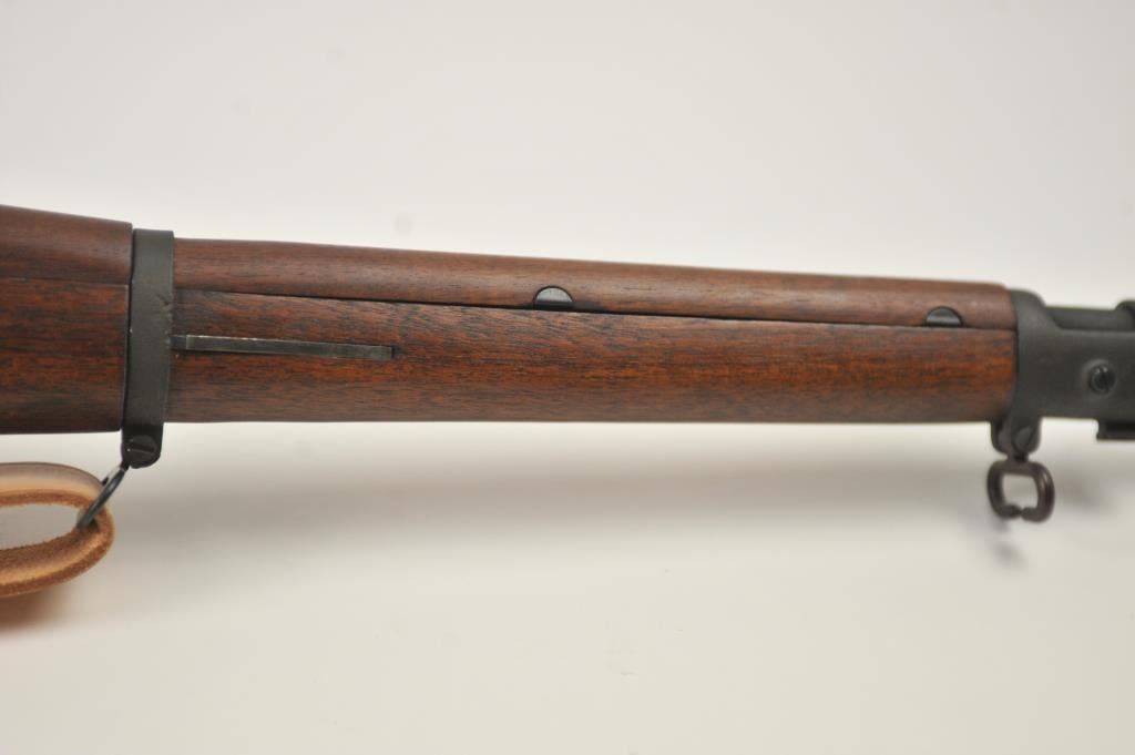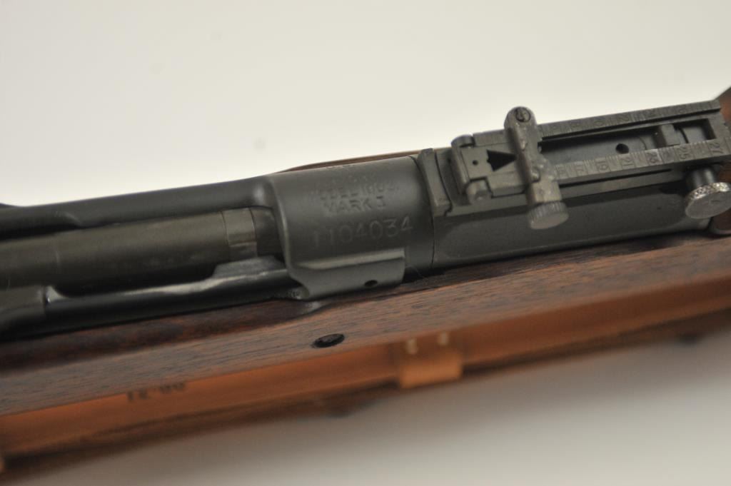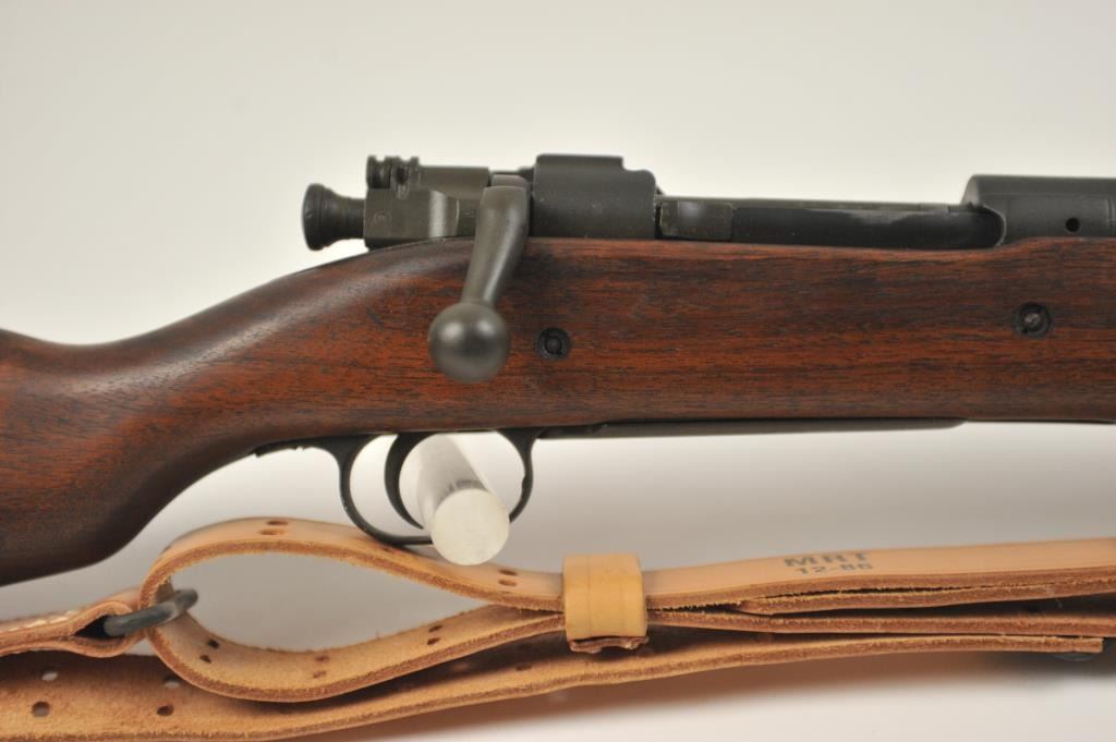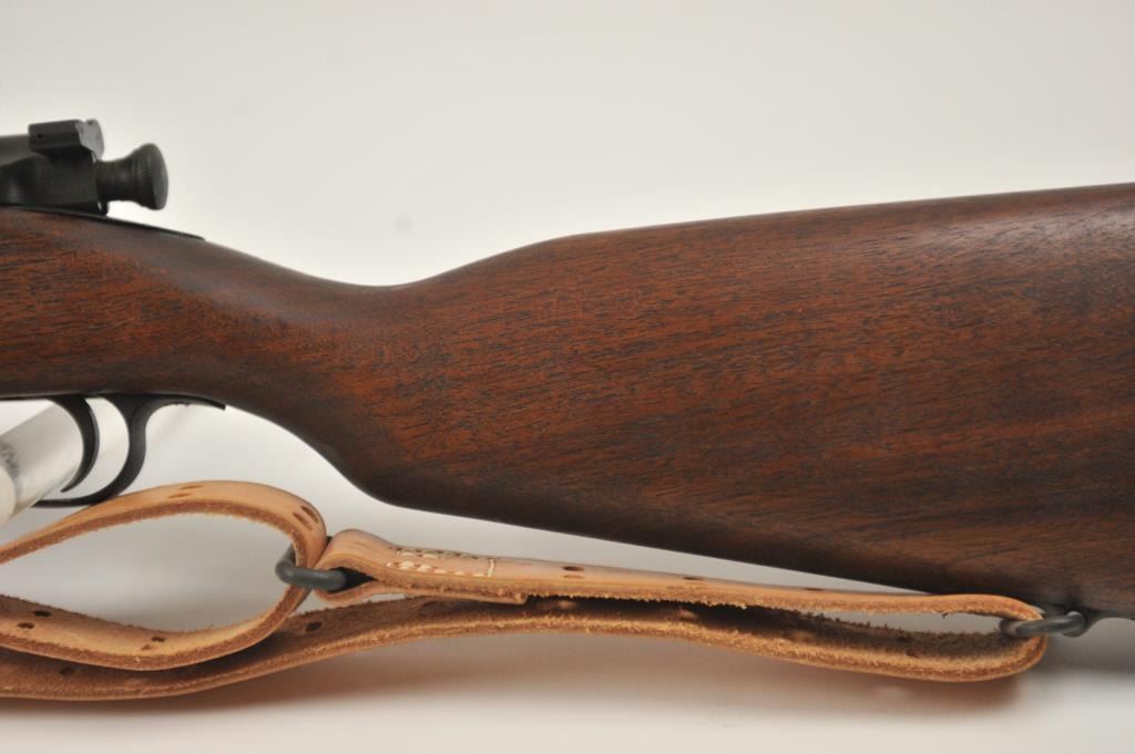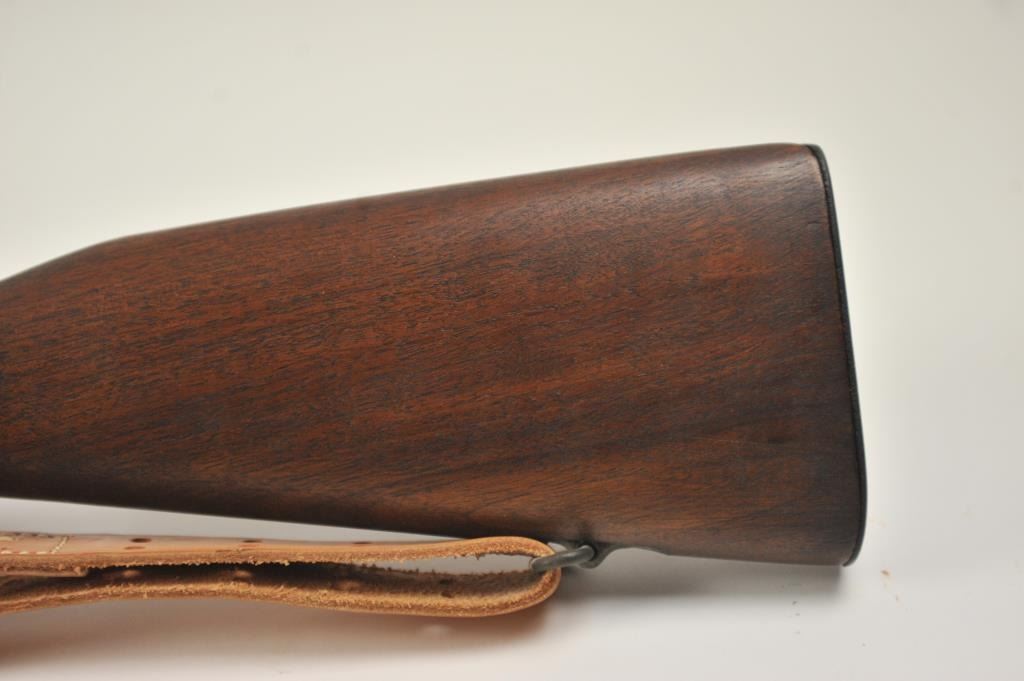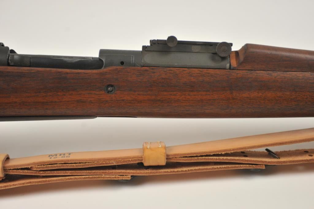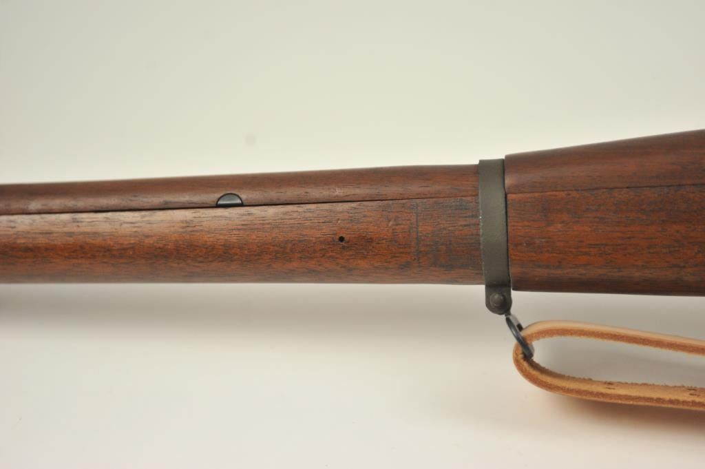 U.S. Springfield Armory Model 1903 Mark I, .30-06 caliber, Serial #1104034. The rifle is in fine overall condition as arsenal rebuilt with the cut-out for the Pedersen device. The rifle retains nearly all of themilitary parkerized finish. The barrel is RA marked and dated 11-43 with the flaming bomb emblem. The smooth wood stock is in very good condition with a crisp cartouche behind the trigger guard, sling swivels and a newmilitary style leather sling. The bore is good, the action is crisp and the markings are sharp on this Springfield 1903 cut for the Pedersen device. Est.: $350-$700. (C+R).