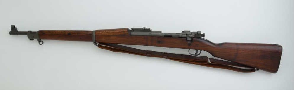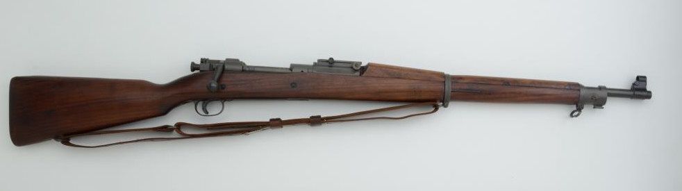 U.S. Springfield Armory Model 1903 Mark I bolt action rifle, cut for Pedersen device, .30-06 cal., 24” SA barrel with flaming bomb proof dated 11-19 with an A under the date, military green finish, front sight cover,wood stock, leather sling, #1129158. This gun is in overall very good to near fine condition showing the majority of its military finish, very good bore, crisp action and markings, very good wood stock withscattered mars from storage, RA-P inspector’s cartouche on the left side of the stock above the trigger guard; trigger shoe added to trigger; leather sling in very good condition. Est.: $800-$1,200.