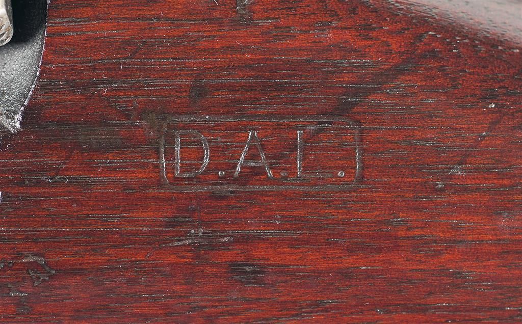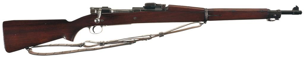 The receiver on this example was manufactured in early 1928. The barrel is stamped with a star gauge mark on the muzzle, "S A/flaming bomb/6- 32" behind the front sight and "K/3072" under the handguard. Has the standard blade front sight and the rear sight does not have the 2,850 yard notch at the top. The bolt is stamped "W L/3" on the top flat of the bolt handle and the top of the bolt body is electropenciled "1286026". The bolt is fitted with a headless cocking knob and reverse safety. Mounted on a smooth walnut pistol grip "C" stock with two reinforcing bolts, a boxed "D.A.L." cartouche on the left side of the wrist, a circled "P" proofmark on the front of the wrist and a coarse checkered steel buttplate. With a brown leather sling dated "1918" and a set of P.J. O'Hare sight covers.