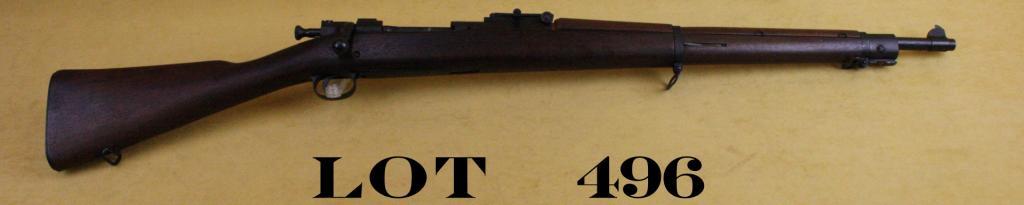 U.S. Springfield Armory Model 1903 bolt-action military rifle, 30-06 cal., 24” barrel, parkerized finish, three sling swivels, bayonet lug, barrel marked “SA” flaming bomb and “4-22”, #1248667. This gunis in overall good condition showing considerable parkerized finish remaining, fair to good bore, crisp action, overall good wood stock with crossed cannons cartouche on left side of stock with “RA” and “FJA”inspection stamps; replaced top stock section in front of receiver showing a split in the wood from end-to-end. This gun would be greatly improved with correct restoration of the one wood section that is cracked;accompanied by bayonet (no scabbard) marked “RIA” dated “1918”. Est.: $600-$900.