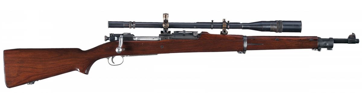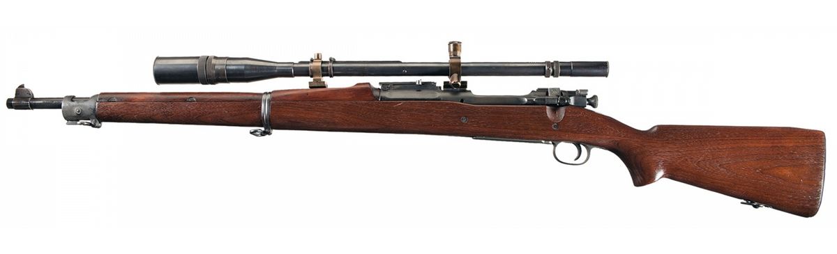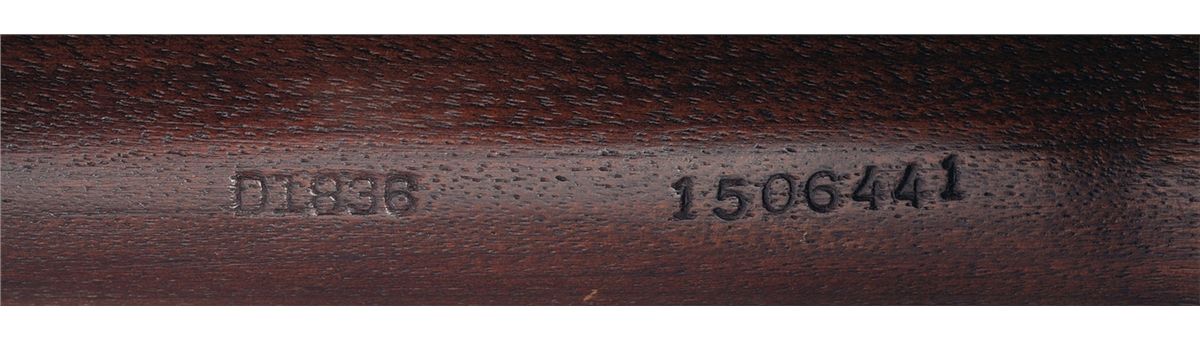 This is a very nice example of a scarce early WWII USMC Model 1941 type sniper rifle as used by the USMC. These were some of the first, true purpose built sniper rifles used only by the USMC. This rifle is based on an early 1903A1 NM rifle that has been fitted with an original 8X, USMC contract, Unertl sniper scope that is complete with the original green micarta carrying case. The scope is marked on the rear of the scope: "J. Unertl/USMC-SNIPER/2233" and is complete with the screw on lens covers. The rifle has been fitted with two early Unertl type, color casehardened bases; one on the receiver and the other on the barrel, with the handguard correctly modified to allow the scope to be mounted. The NM barrel is marked behind the front sight: "SA/Flaming Bomb/3-37" and is correctly stamped with the small star-gauge mark on the muzzle at the 6 o'clock position. The rifle has been fitted with the correct pre-war bright polished Nickel Steel bolt marked "N.S." on top of the bolt handle, which has been numbered (1506441), which matches the rifle. The rifle has an original pre-war walnut "C" stock with two reinforcing bolts, a single circled "P" proof in the pistol grip area along with the matching serial number and drawing number stamped on the rear underside of the stock. The stock has the correct checkered steel buttplate with trapdoor containing a plastic oiler with a pull through patch holder. It has the standard fixed front sight with a late style ladder rear rear sight graduated from 200-2,800 yards without the 2,850 yard notch.