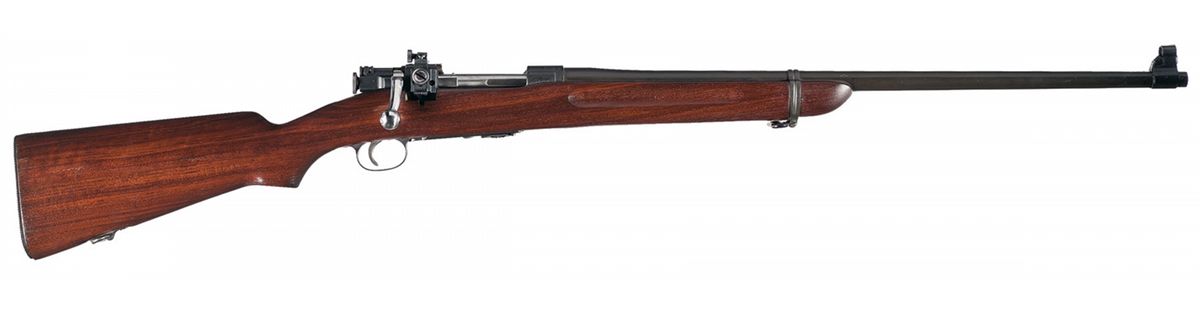 Manufactured between 1924 and 1933. This example was converted to the M2 version. There is a fixed front sight with clip on hood and the barrel is marked "S A/flaming bomb/6-27". The receiver has a replacement Redfield fully adjustable peep sight mounted on the right rear. The M2 bolt is numbered to another gun on the bottom in electropencil. Mounted on a smooth walnut pistol grip stock with finger grooves, sling swivels and a checkered steel buttplate. Marked "M2" on the grip cap area and just behind it is marked "D-28225".