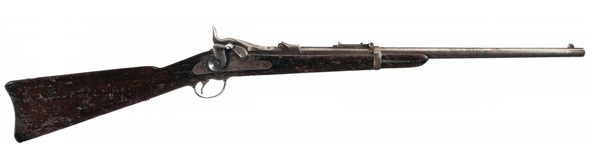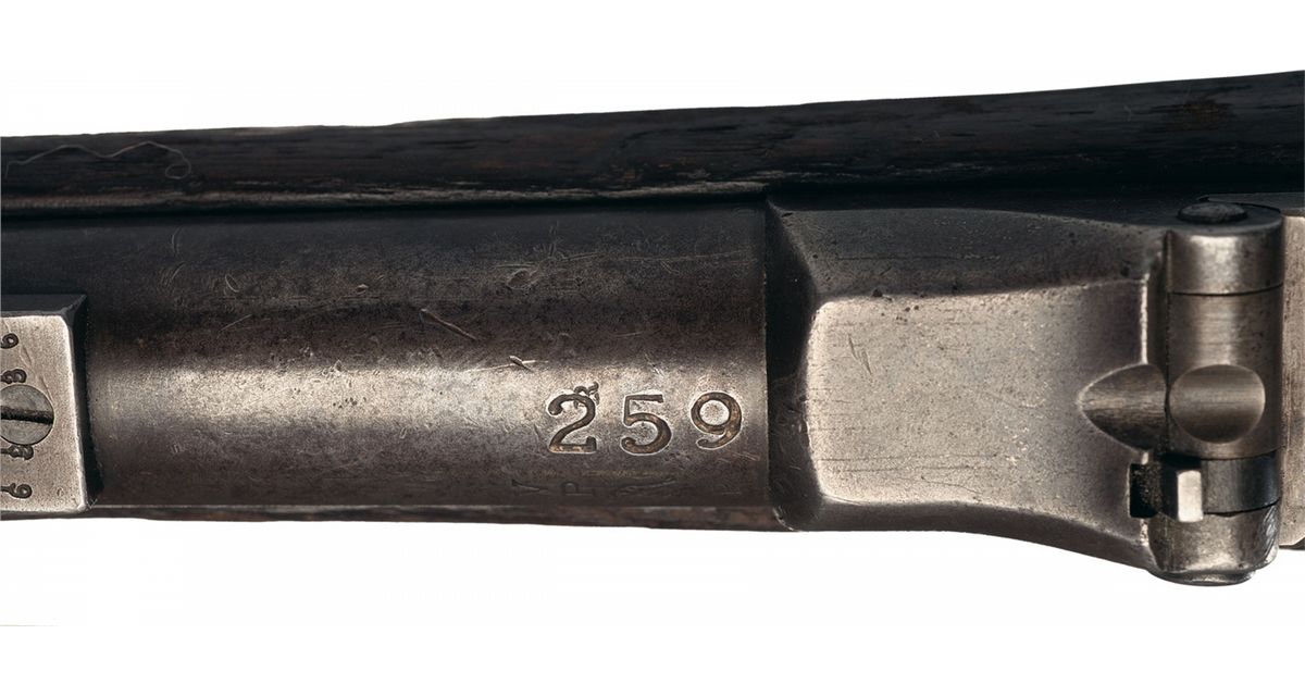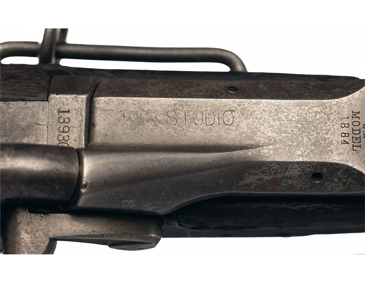 Action in Model 1879 Carbine with Model 1884 sight and breechbolt. Proof marked "V, P" over the Eagle Head proof on the left rear portion then over a smaller "P" and the number "259" marked next to it on top of the barrel. The serial number is stamped on the rear of the receiver ahead of the tang. Front fixed sight with Buffington rear adjustable sight, a metal barrel band and rear sight protector. The breech block is the low arch model is marked "US/Model 1884" along with "FOX STUDIOS". The lock plate is marked "US/SPRINGFIELD" next to the American Eagle. "FOX" is also marked on the left side of the receiver. The stock has a saddle ring and bar mounted on the left side. Steel buttplate has trap door. (cleaning rod not included)