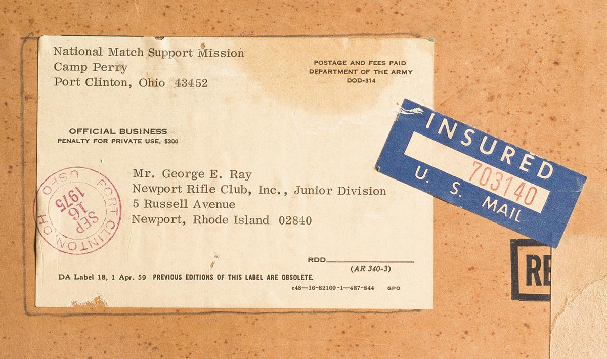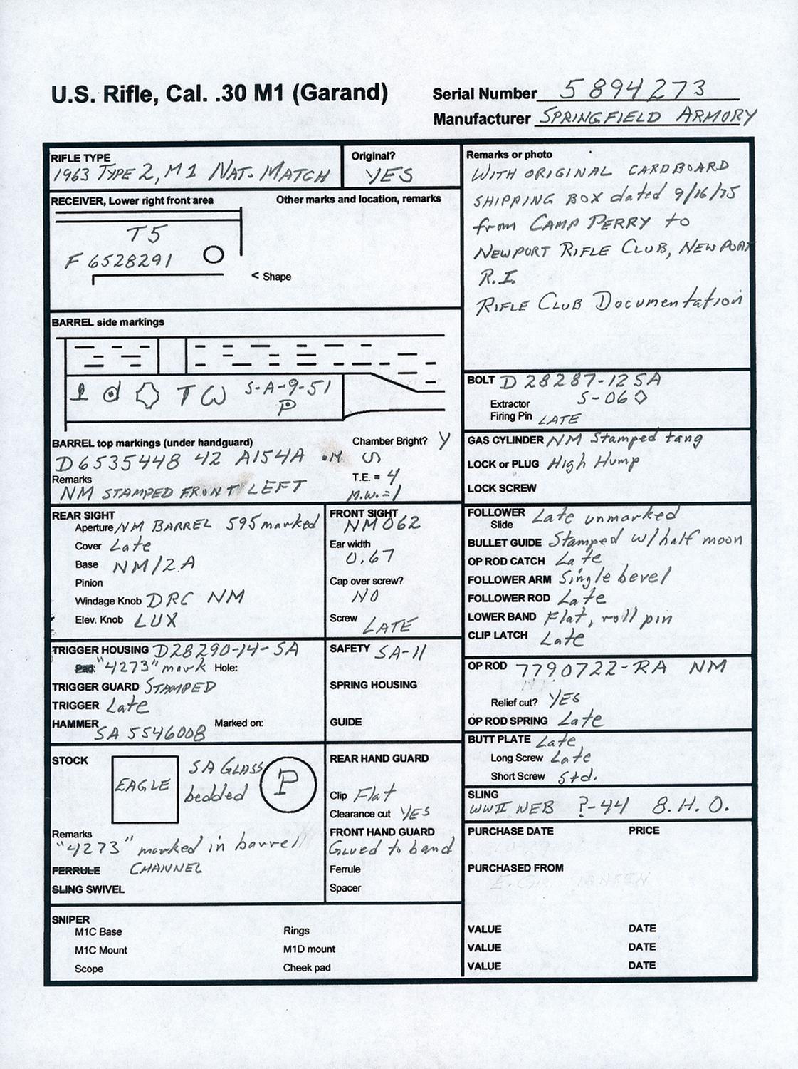 Produced by Springfield Armory in 1963, approximately 3630 of these Type 2 National Match rifles were produced. Front sight is marked "NM/ 062", rear marked "595" on the cylinder, "NM" on the shank and windage knob, "NM/ 2A" on the right side base, with "NM" marked barrel, gas tube and operating rod, Springfield "9-51" dated barrel with "inverted T, P, cross, T, inverted heart" markings, matching partial numbers inside the floor plate and inside the stock barrel channel, Springfield safety, hammer and trigger housing and "7790722 RA" operating rod. The stock is fiberglass bedded, with glued front handguard, Department of Defense stamp on the left side, circled "P" with serifs on the pistol grip, checkered buttplate and a green canvas sling. With an original shipping box from Camp Perry to the Newport Gun Club, photocopies of Springfield Research Service data that puts the rifle with the aforementioned club, and two inventory manifests from the club, dated 1992 and 1993, confirming the rifle in the club's inventory.