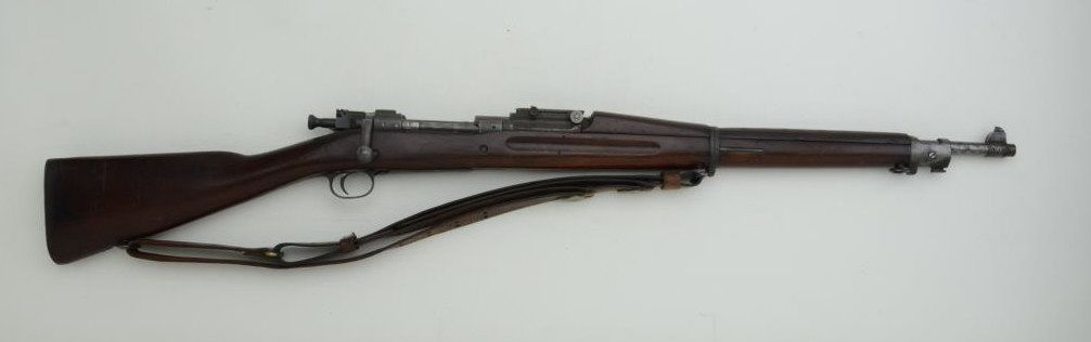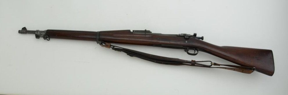U.S. Springfield Armory early Model 1903 bolt action rifle, .30-06 cal., 24” R.I.A. barrel dated 12-18, wood stock, leather sling, #53926. This gun is in overall good condition as re-built with muted military finish tometal surfaces, receiver tapped and re-filled on right side; fair bore, good markings, crisp action, good wood stock with two circle P proofs and “A.D.A.L.” stamped on the left side of the butt stock above the trigger.From an old estate. Est.: $350-$700.