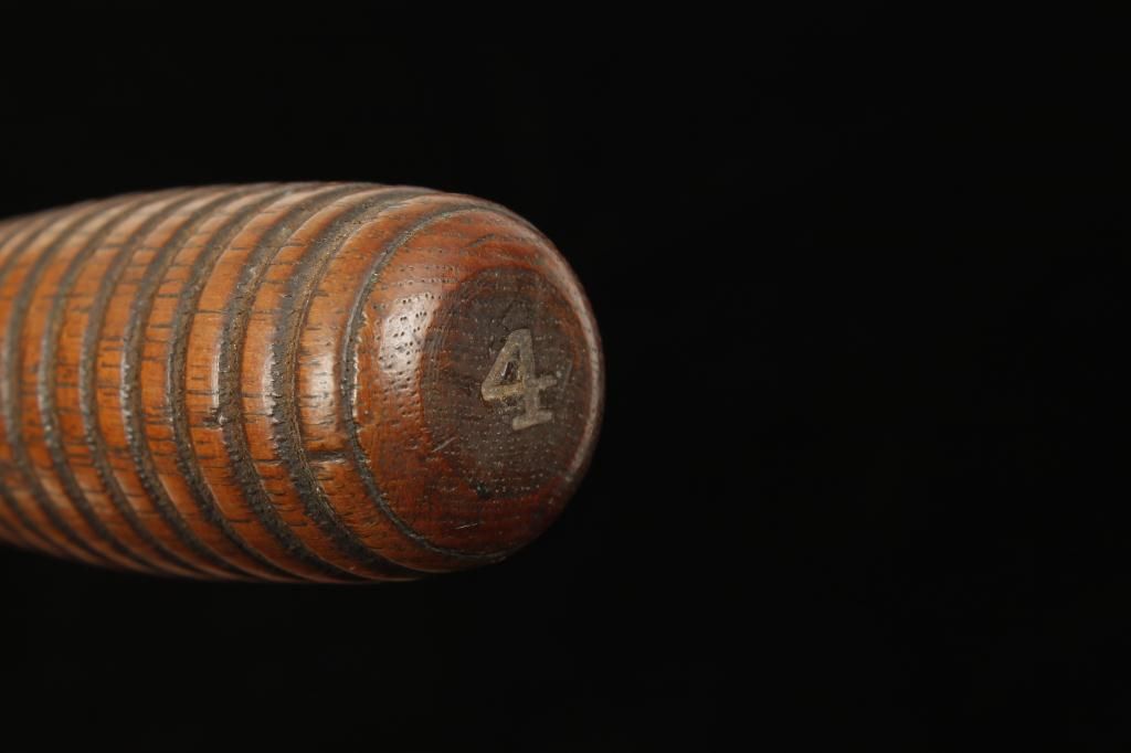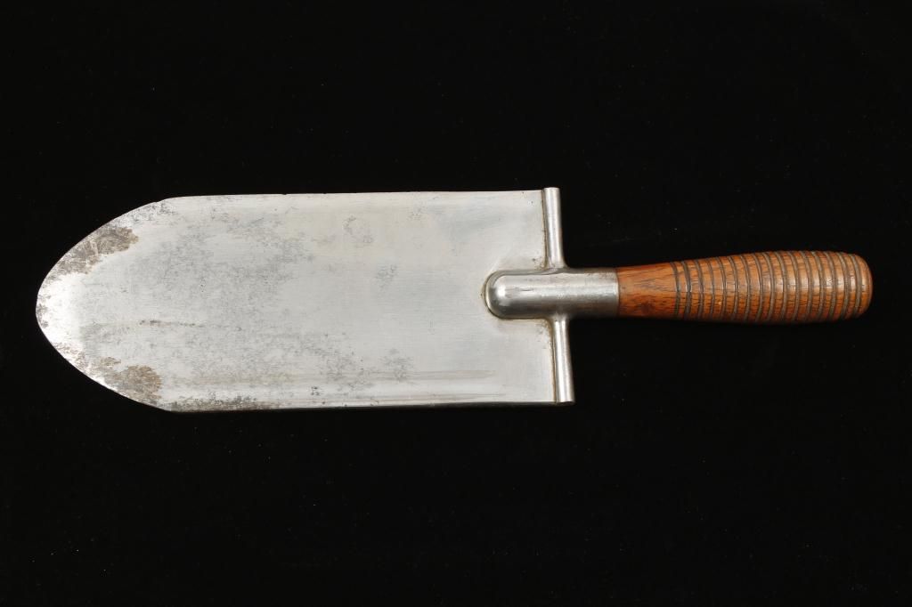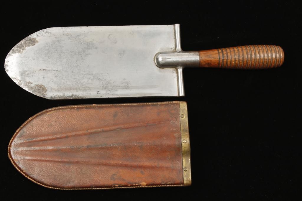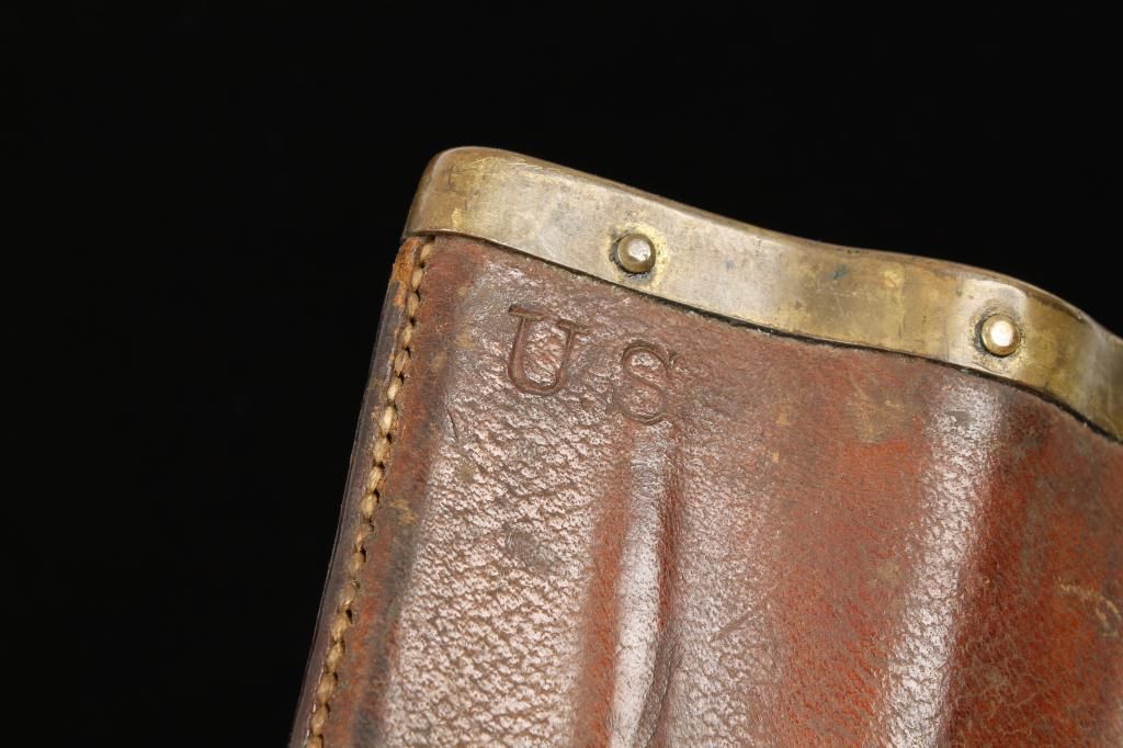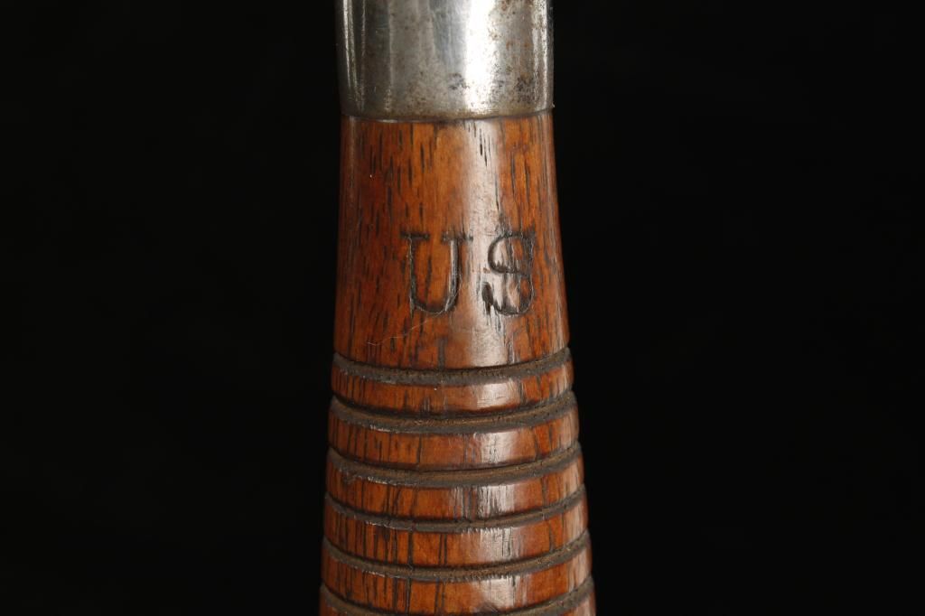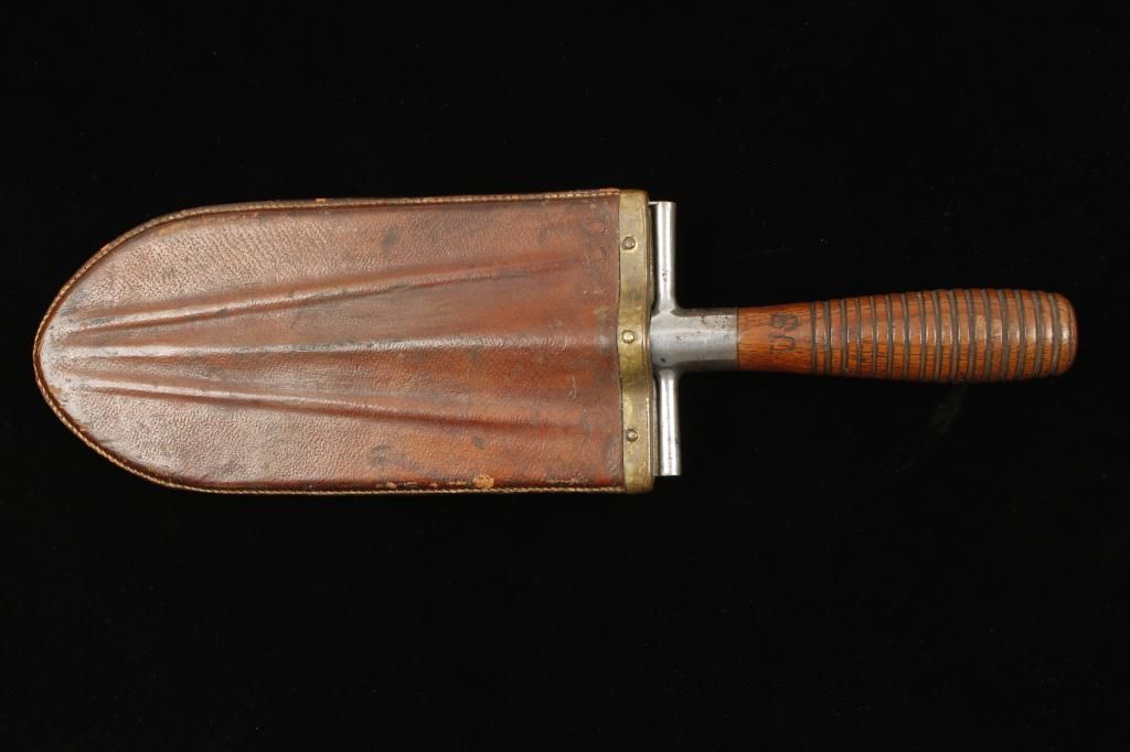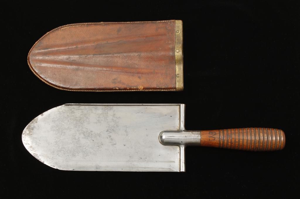 U.S. Springfield Entrenching tool with leather sheath in overall fine condition; wood grip with “US” stamp at base; leather sheath also “US”-stamped; one of the nicest examples we’ve seen in some time. Est.:$300-$600.