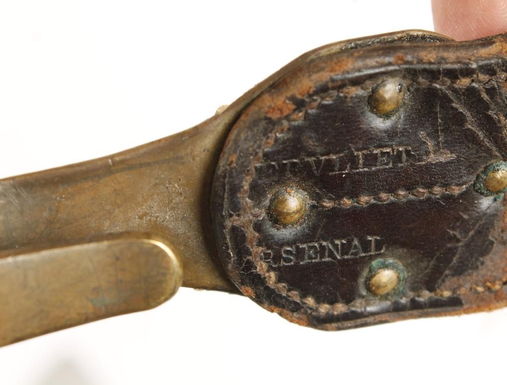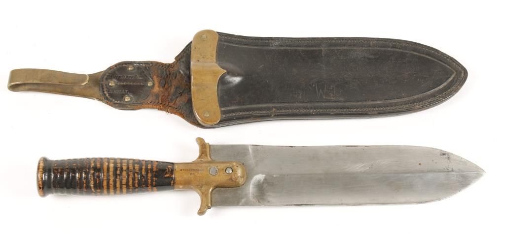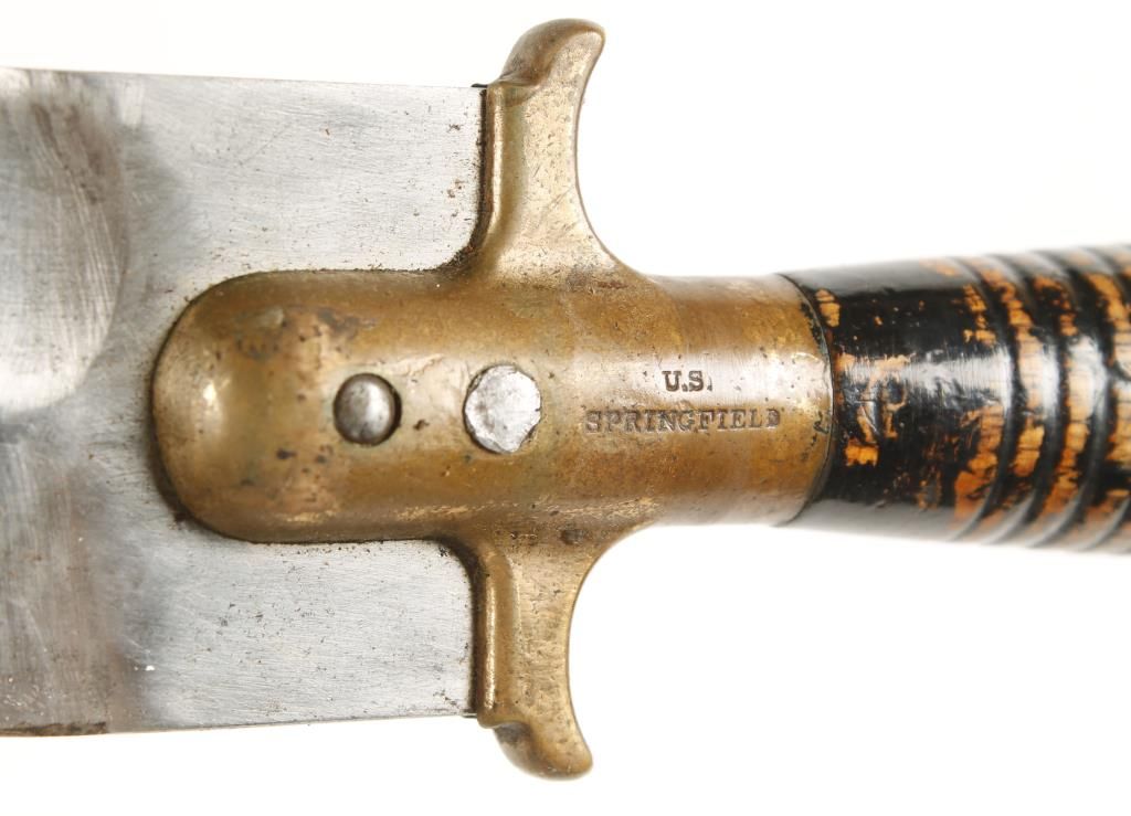 Hunting knife with wood handle and brass guard. Guard marked " U.S. Springfield" and "733". There is mottling and scratching to blade, and handle was originally painted black, but some of the paint has worn off. Approx 13-1/4" overall with 8-1/4" blade. Also includes leather sheath marked "Watervliet Arsenal". Approx 14-1/2" overall.