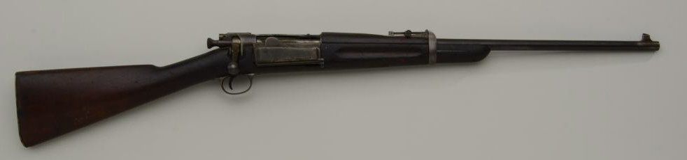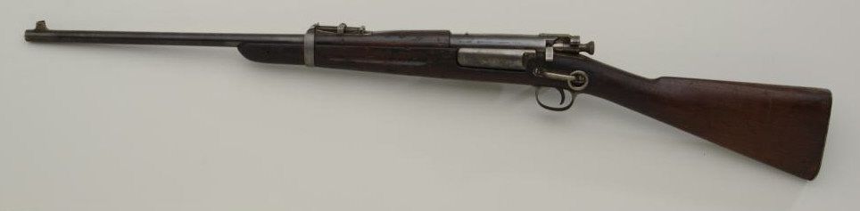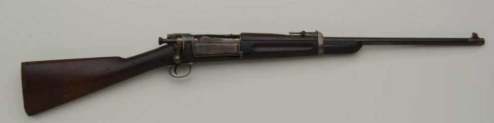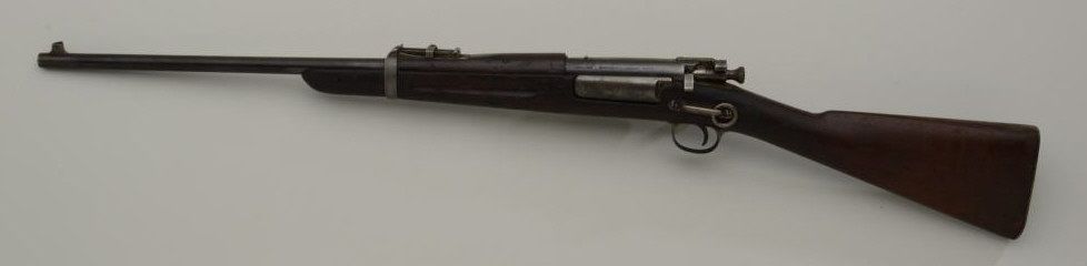 U.S. Springfield Krag Model 1896 bolt action SRC, .30-40 Krag cal., 22” barrel, blue and case hardened, wood stock, #75395. This gun is in overall good condition showing a plum brown patina with scattered light erosion and pinprick pitting, some faint traces of original case colors in protected areas of receiver, fair bore, good action and markings, wood stock shows heavy use with scattered old mars, dings and scratches fromcarry and storage; partially visible circle P proof behind trigger guard. Est.: $400-$800.