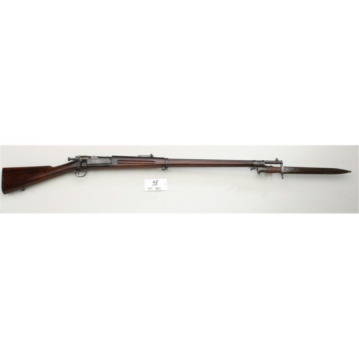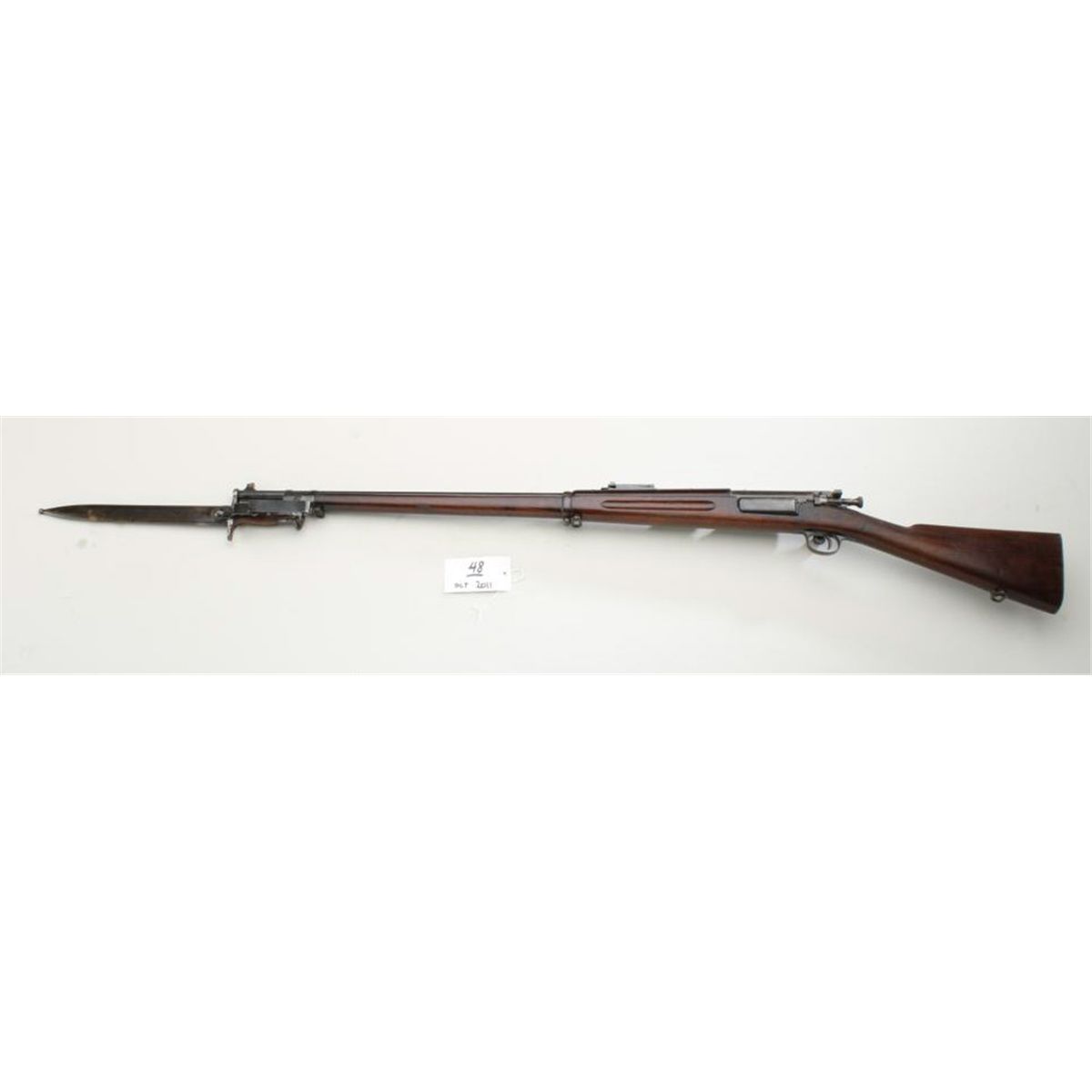 U.S. Springfield Krag Model 1898 bolt-action military rifle, .30-40 Krag cal., 30” barrel, blue and case hardened finish, full wood stocks, sling swivels, #123607; with bayonet, scabbard and hanger. This gun is in overall fine condition showing approx. 65% original muted blue finish on the barrel with traces of case color and silvery toning on the receiver, crisp action, strong markings, overall very good bore, very good to finestock with some scattered mars and scratches from carry and storage, circle P proof behind the trigger guard and a sharp inspector cartouche on the left side of the butt stock above the trigger guard; accompanied by aKrag bayonet in very good condition dated 1903 with a good metal sheath and metal hanger. Est.: $750-$1,500.