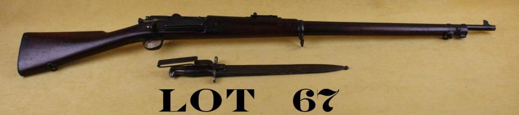 U.S. Springfield Krag Model 1898 bolt-action military rifle, 30-40 Krag cal., 30” barrel, military finish, wood stock, #375233. This gun is in overall good condition showing an older military refinish, possibly arsenal,good bore, crisp action, untouched patina on metal surfaces and wood stock that is overall good with visible cartouche on left side of wrist above the trigger, sling swivels, accompanied by an 1898 dated correct Kragbayonet and metal scabbard with hanger; this serial number is in a range of Krag rifles given to the U.S. Navy by the Army; would be interesting to further research. Est.: $500-$750.
