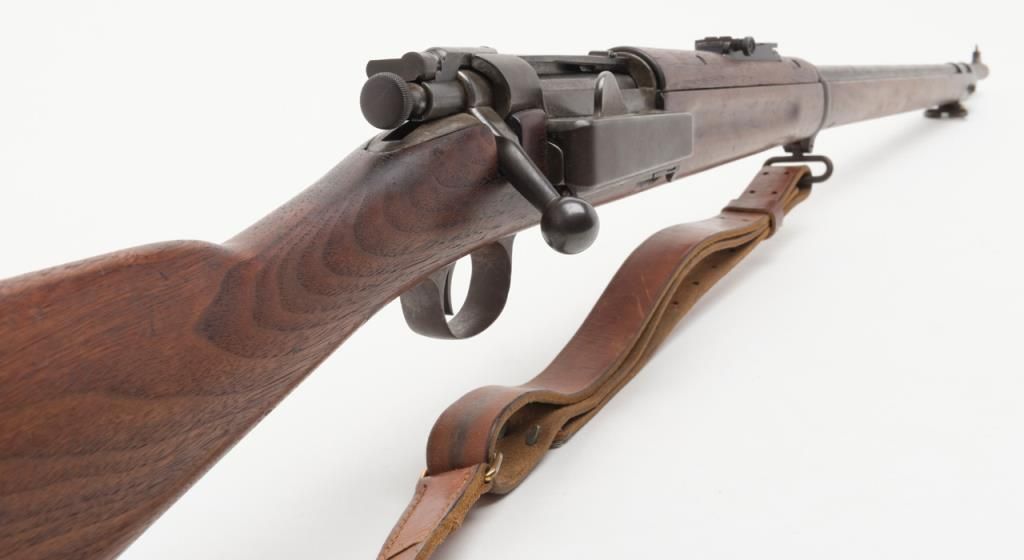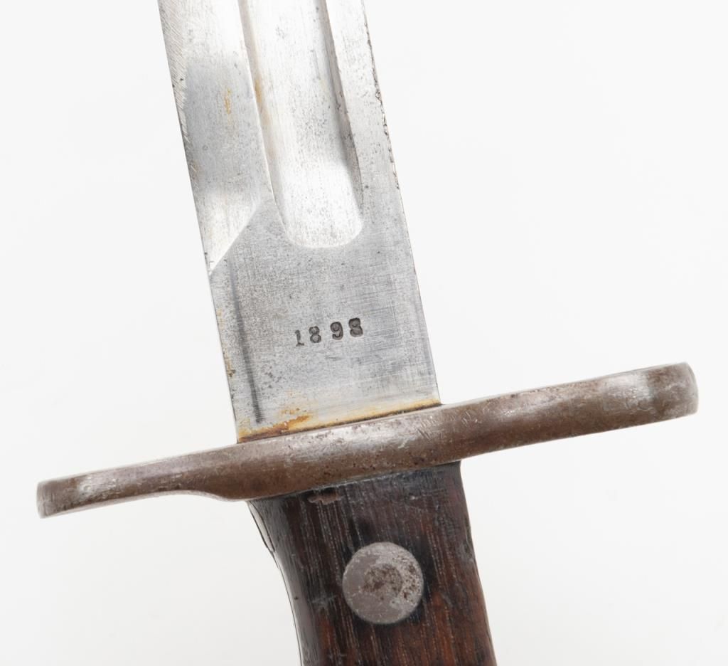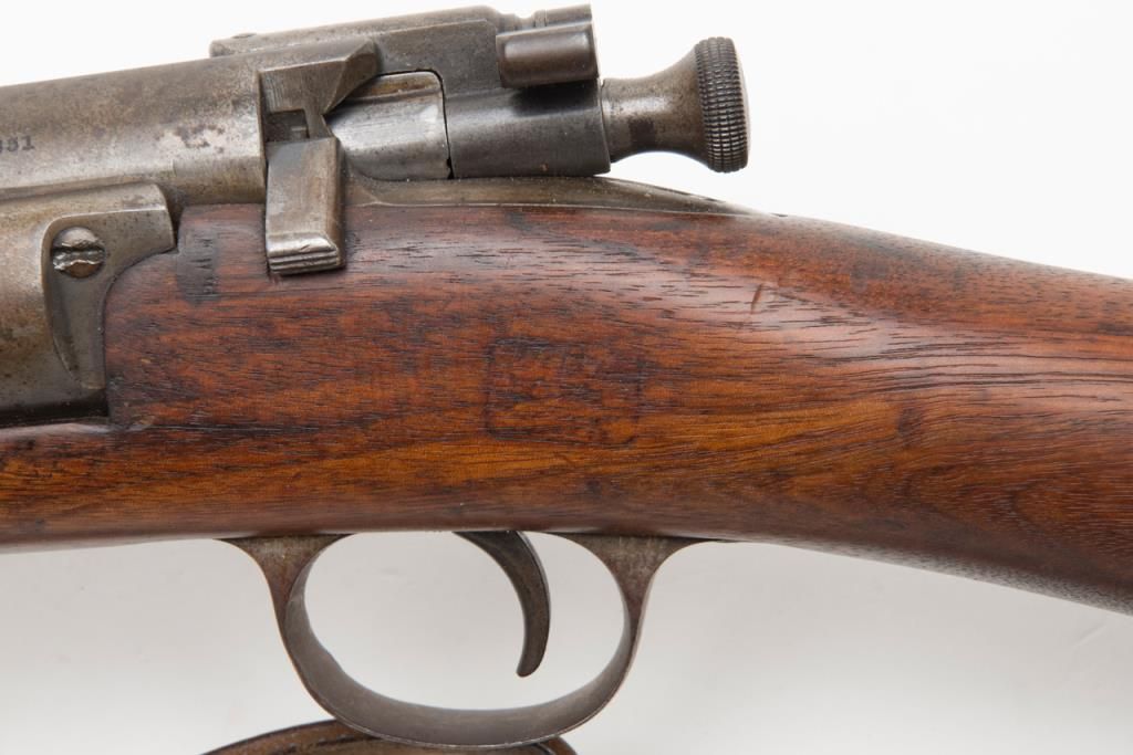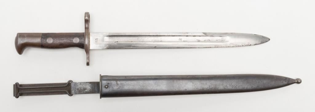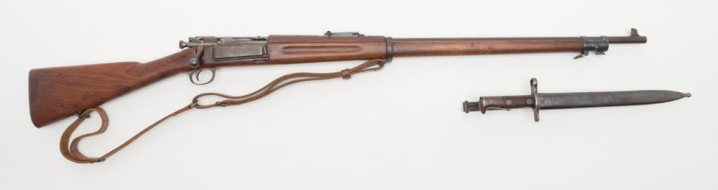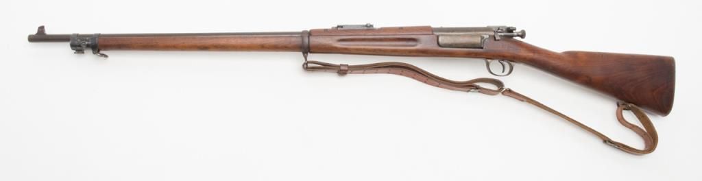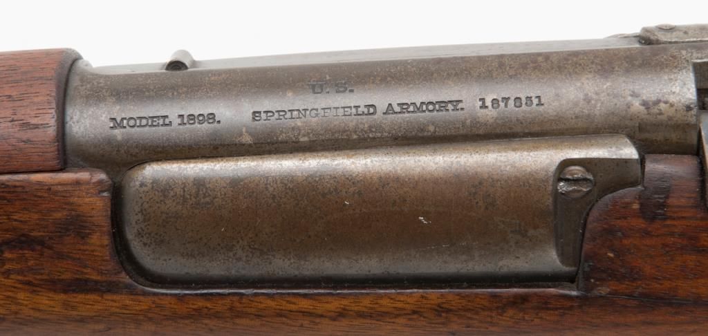 U.S. Springfield Krag Model 1898 bolt action rifle, .30-40 Krag cal., 30” barrel, blue and case hardened finish, full length wood stock, leather sling, with bayonet and metal scabbard, #187851 in overall very good + condition showing blue mixedwith a brown patina on barrel and toning of finish on the receiver; very good bore, crisp action and markings, very good wood with some minor old mars and scratches from carry and storage; visible circle P proof and partially visible 2-digitnumber behind the trigger guard with inspector’s cartouche on left side of stock above trigger assembly; Brauer Bros. St. Louis marked leather sling with 1898 dated bayonet and metal scabbard with hanger in very good condition. (C&R). Est.: $500-$1,000.