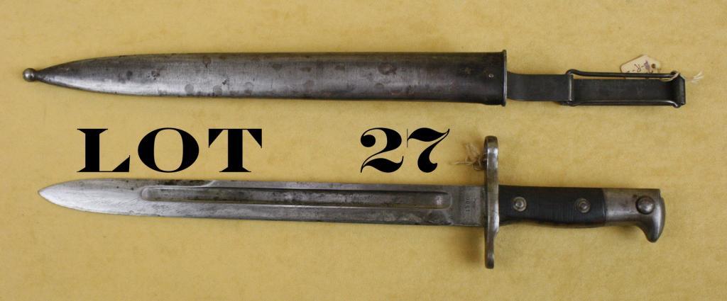 U.S. Springfield Krag rifle bayonet and metal scabbard in overall good condition; knife shows some old sharpening and scattered areas of erosion but overall good with wood grip and overall good metal scabbard with metalhanger; some traces of original blue on scabbard at tip and at hilt with scattered spots of erosion on the body of the scabbard. Est.: $125-$250.
