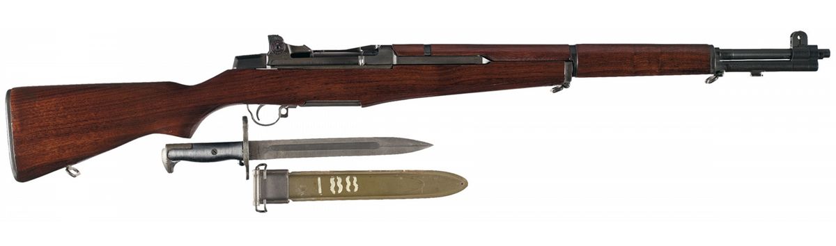 Produced in January of 1943, this rifle received a post-WWII refit and upgrade with National Match components. "NM/062" marked front sight and "NM/2" marked rear sight with swiveling eye cup, "NM BME" windage knob and "WC E" elevation knob. The barrel is marked "NM" on the left and " NM (star) T SA F9535448 P 9 54 A2140 DOD eagle" on the chamber. Smooth stock with a Defense cartouche on the left side, "P" on the grip and a checkered steel buttplate. Also included is an undated U.S. "U.C." bayonet, 10 inch blade with ribbed grip and green sheath.