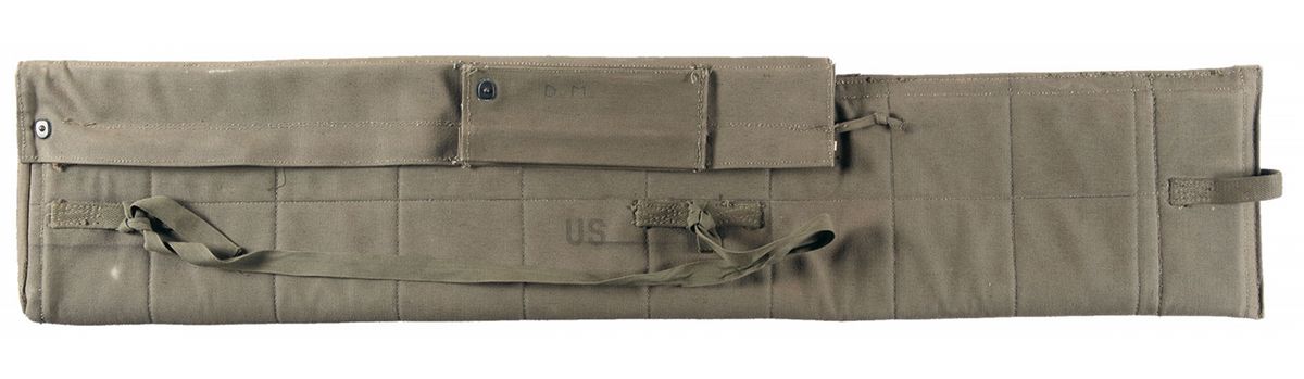 Manufactured originally in December of 1941 and subsequently arsenal rebuilt. Fitted with a "NM 062" marked front sight with a fixed eyecup installed on the rear sight and "DRC" and "HR A" drums. Equipped with a Winchester bolt, WRA trigger housing, SA hammer, safety and operating rod and a "S-A-6-50" barrel. The right side of the receiver is hand marked "A4/9-64". Smooth pistol grip stock with an uncircled "P" stamp on the wrist, an "ATLAS 1944" stamped sling and a checkered buttplate with cleaning rod and oiler. Also included is a Model 1950 weapon case, dated 9 Feb 1951.